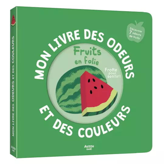 La collection « Les Odeurs » propose une couleur, un imagier et une odeur par double -page sur le thème des fruits en folie. Chaque page de gauche présente une couleur grâce à de jolies illustrations simples et enfantines, mais que se cache -t-il derrière le rabat ? En frottant son doigt, l’enfant y découvrira l’odeur d’un fruit de la couleur de la page.
