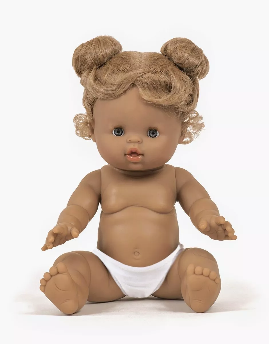Louise, poupée Gordis métisse exclusive Minikane®, vendue sans culotte. – 34cm – Cheveux blonds coiffés avec chignons et mèches – Yeux gris bleus Poupée articulée et sexuée en vinyle parfumé à la vanille, vendue protégée dans son sac plastique. Compatible avec l’ensemble des vêtements et accessoires Gordis.
