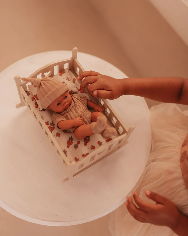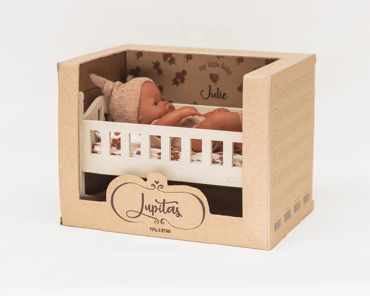 Les Lupitas sont des poupées extrêmement malléables et légères. Ils mesurent 20 cm, sont livrés avec un berceau à bascule en bois et du linge de lit (matelas, oreiller et drap)