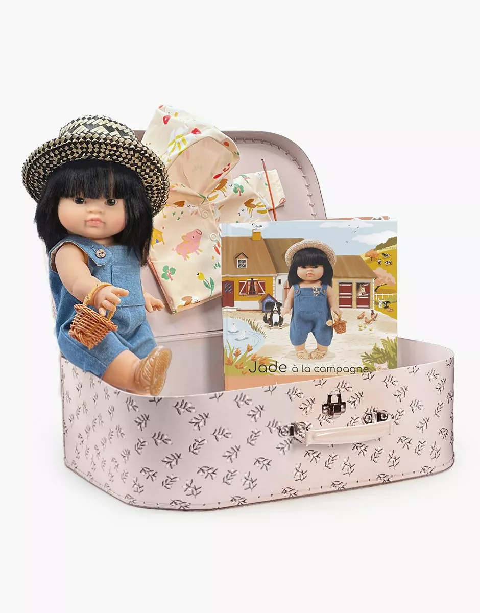 Valise d’antan « Jade à la campagne » : un coffret regroupant une poupée Minikane Gordis 34cm, ses vêtements / accessoires à thème et son livre pour enfant associé. Le Coffret Valise d’antan « Jade à la campagne » comprend : • une valise cartonnée Olivier, • une poupée Minikane Gordis 34cm Jade, • un livre jeunesse « Jade à la camapgne », • une salopette à boutons Antonin en jean bleu clair, • un imperméable Clotaire en coton enduit Picoti, • une paire de sandales « Sun » couleur crêpe pailletée, • un chapeau de paille Pablo noir, • un mini panier en osier.