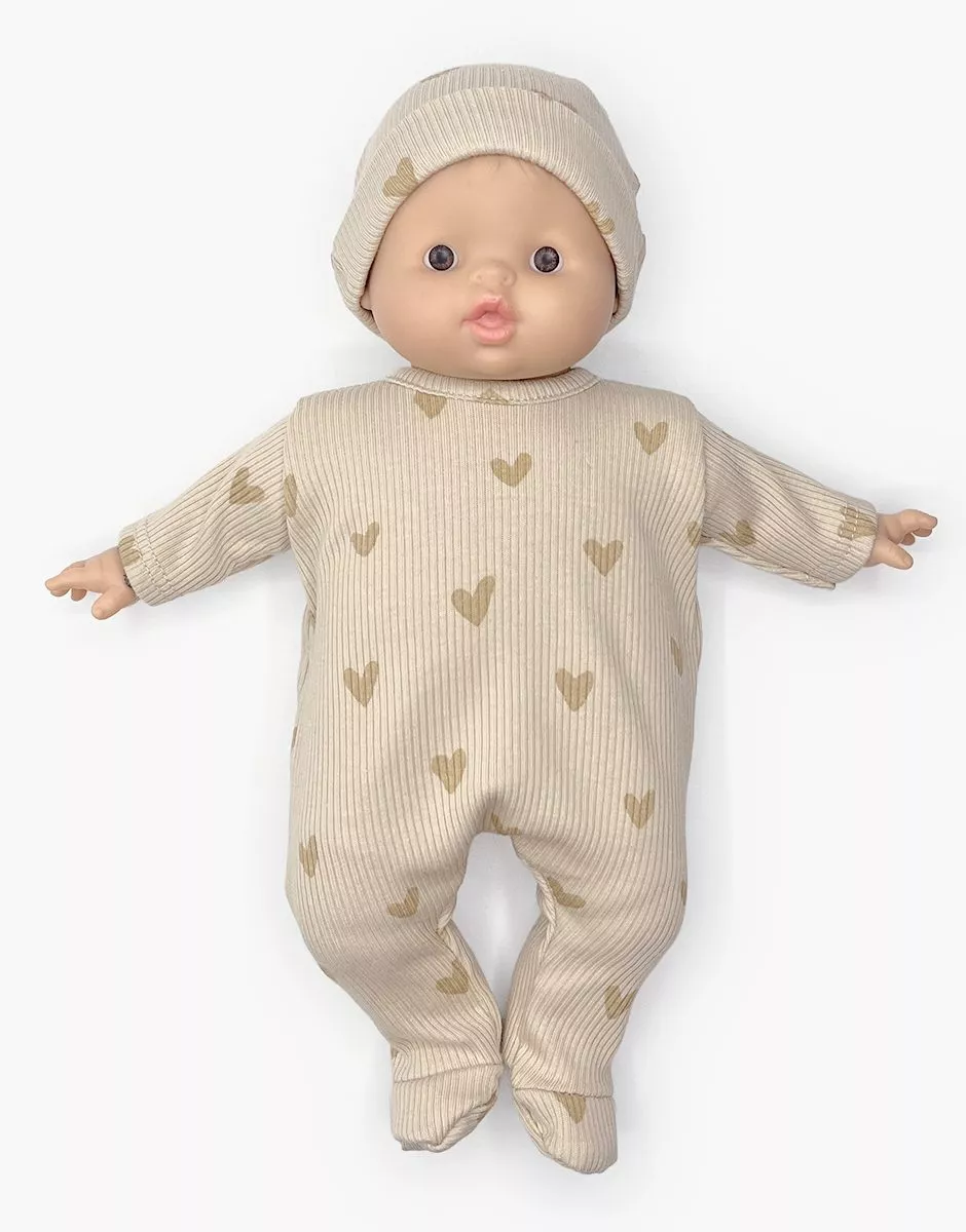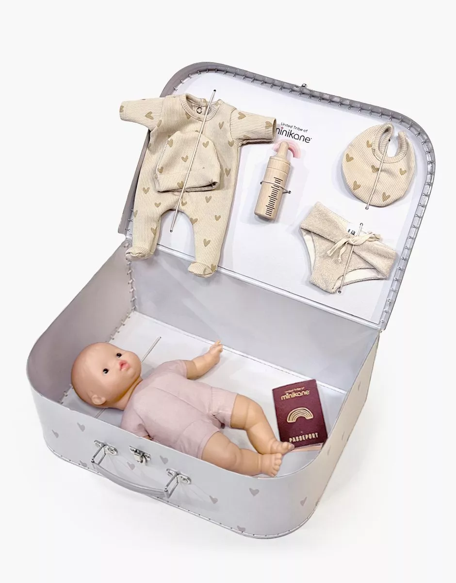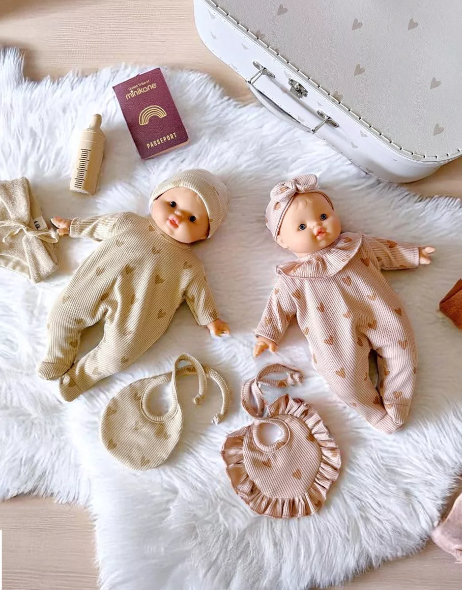 Ma Valise d’antan “Kit de Naissance” mixte Petits coeurs beiges pour poupées Babies 28cm