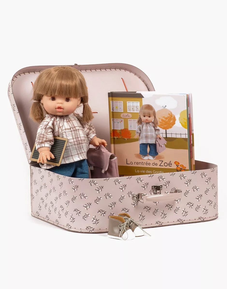 Ma Valise d’antan « La rentrée de Zoé » comprend : • 1 valise Oliviers • 1 poupée Zoé • 1 ensemble blouse d’écolière à carreaux et pantalon en jean bleu clair • 1 paire de baskets Komvers en simili cuir taupe • 1 cartable Swan en simili cuir rose • 1 Mini ardoise. • 1 livre « La rentrée de Zoé »