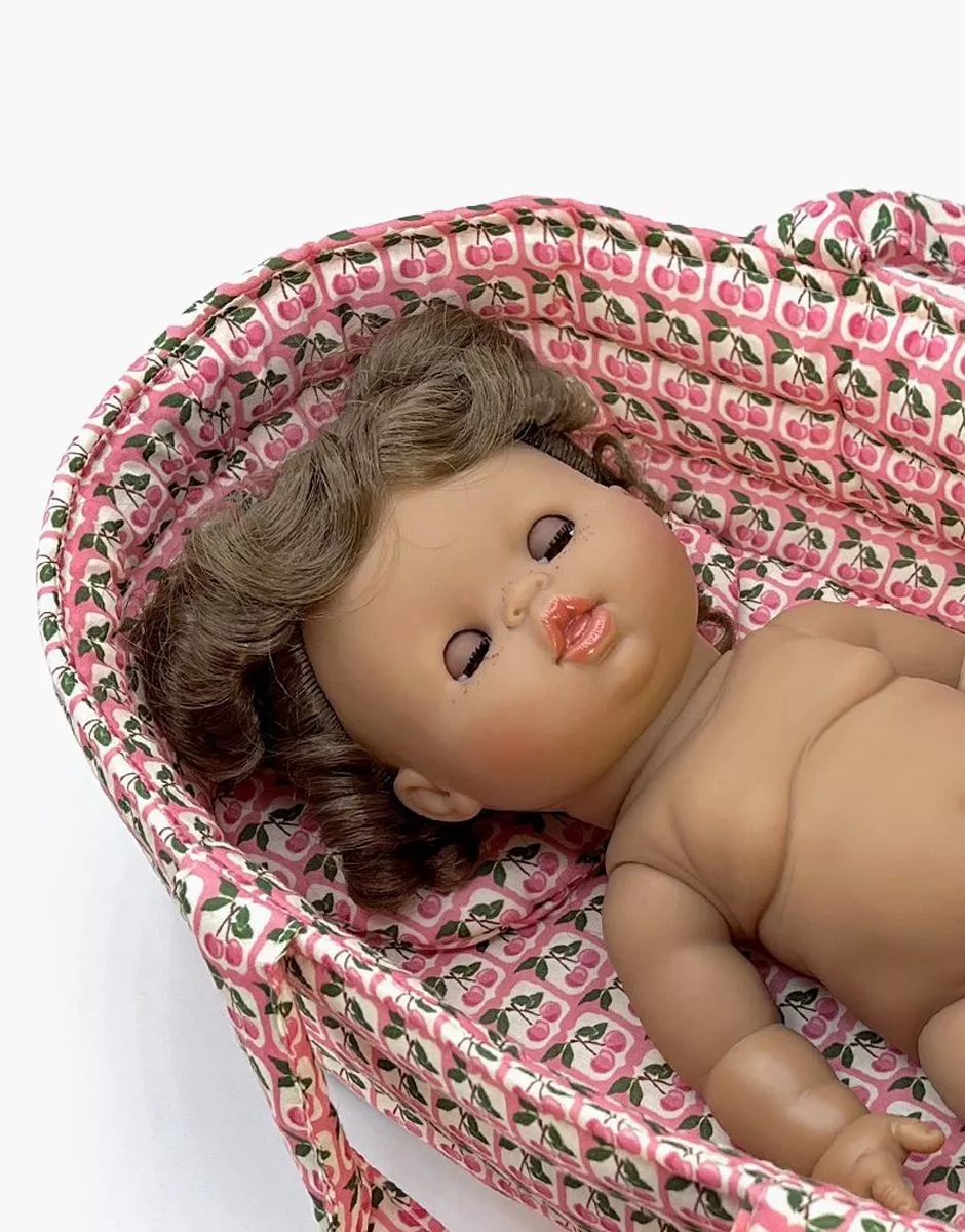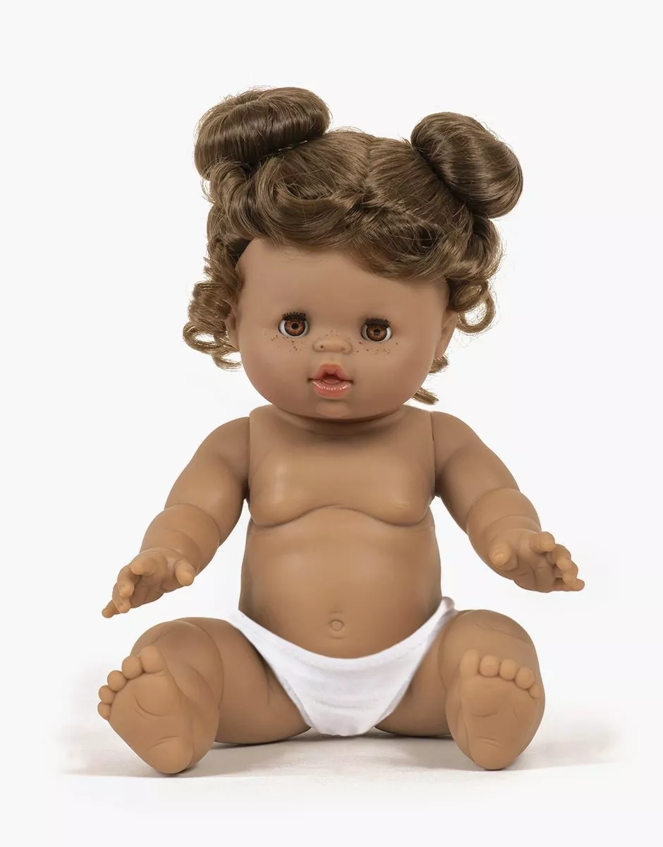 Madeleine, poupée Gordis métisse aux yeux dormeurs exclusive Minikane®, vendue sans culotte. Elle s’allonge en fermant les yeux et se réveille en les ouvrant ! – Taille de 34cm. – Cheveux bruns bouclés coiffés avec macarons. – Yeux articulés couleur caramel. Poupée sexuée avec corps en vinyle parfumé à la vanille. Compatible avec l’ensemble des vêtements et accessoires Gordis.