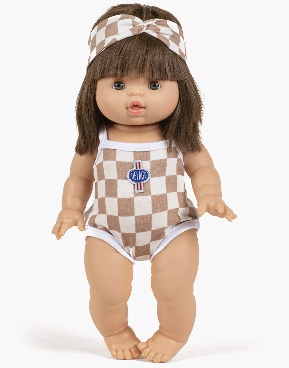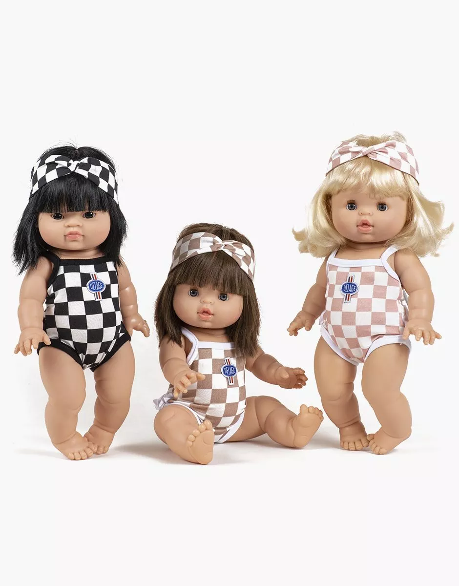 Collection Minikane X Delage – Maillot RACING en jersey damier beige et blanc pour poupées Gordis 34 & 37cm. Design, développement & confection made in France. Design, development & tailoring made in France.