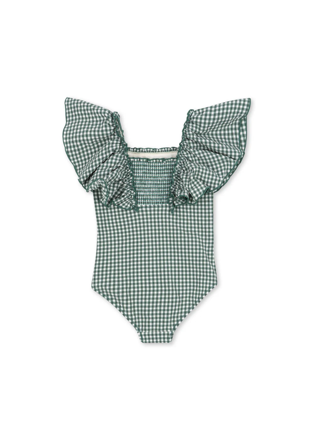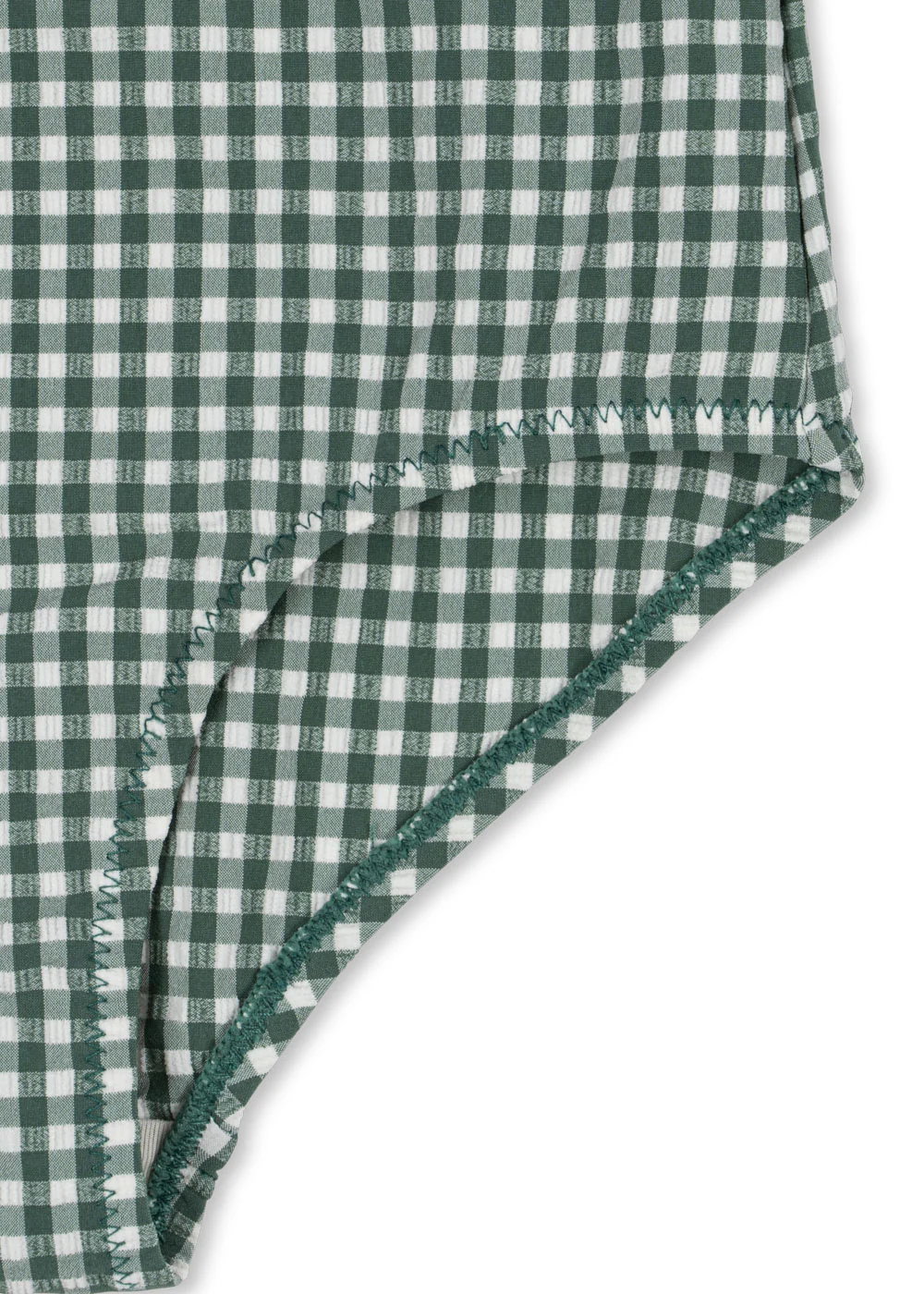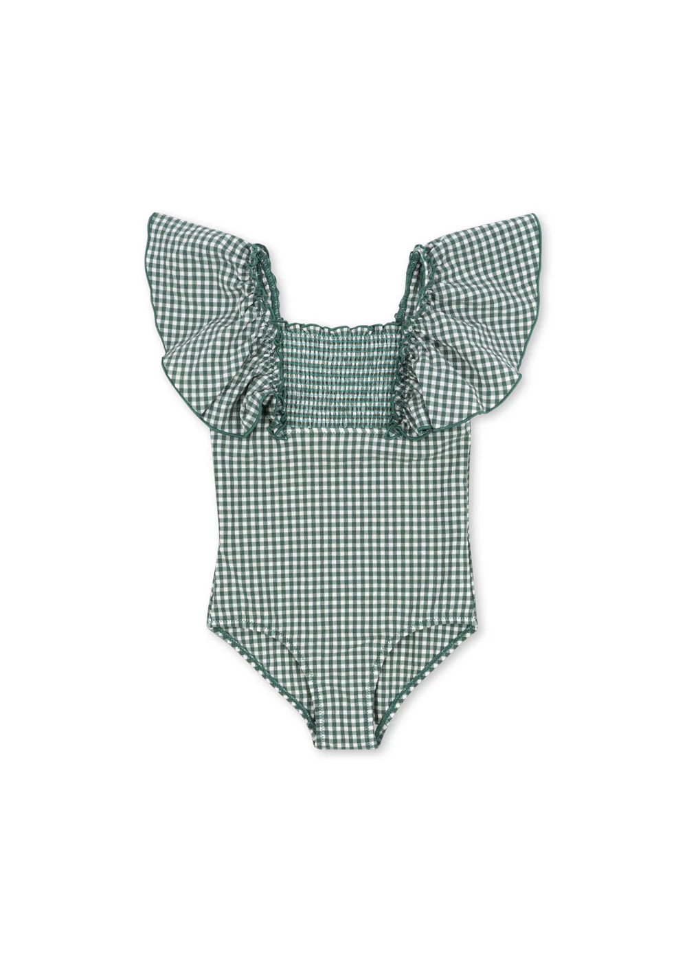 Plongez dans l’été avec style grâce à ce maillot de bain une pièce vichy vert signé Konges Slojd. Élégant et confortable, il se distingue par son effet gaufré tout doux et ses manches volantées qui ajoutent une touche raffinée. Son imprimé vichy vert intemporel en fait une pièce chic et tendance pour les journées ensoleillées à la plage ou à la piscine.