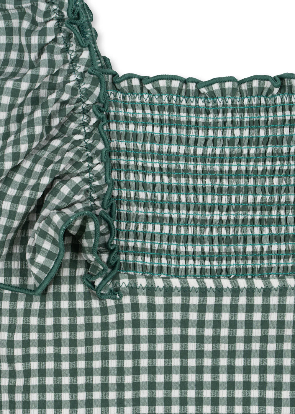 - Imprimé vichy intemporel : Ses carreaux verts tendance apportent une allure rétro et chic, idéale pour un été stylé.