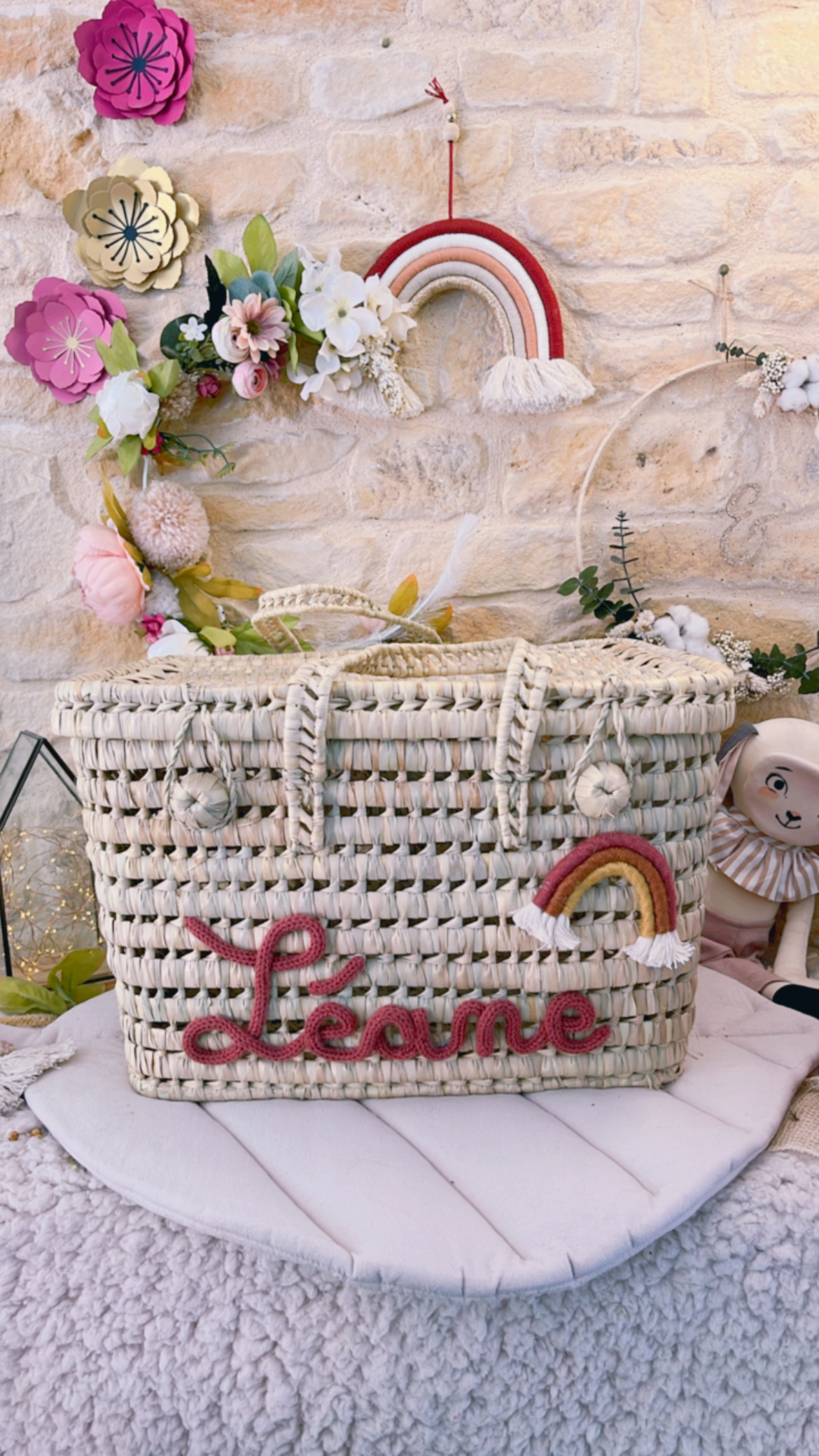 Malle à jouets taille Médium avec arc-en-ciel en macramé Malle à jouets en feuille de palmier tressé rigide avec rabat pour la fermer. Idéal pour une chambre d’enfant ou une salle de jeu. Dimensions +/- 40cm de long, 30cm de large et 27cm de haut environ. Prénom et pompons en laine pour un meilleur maintien. […]