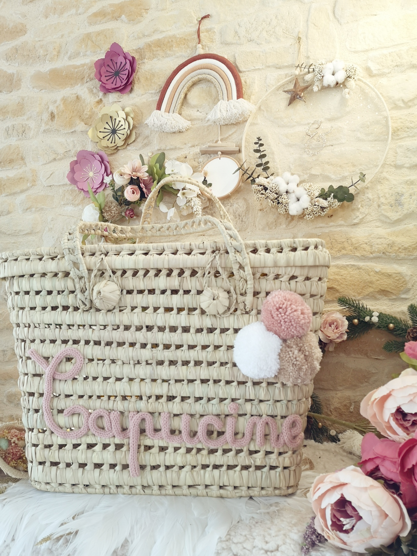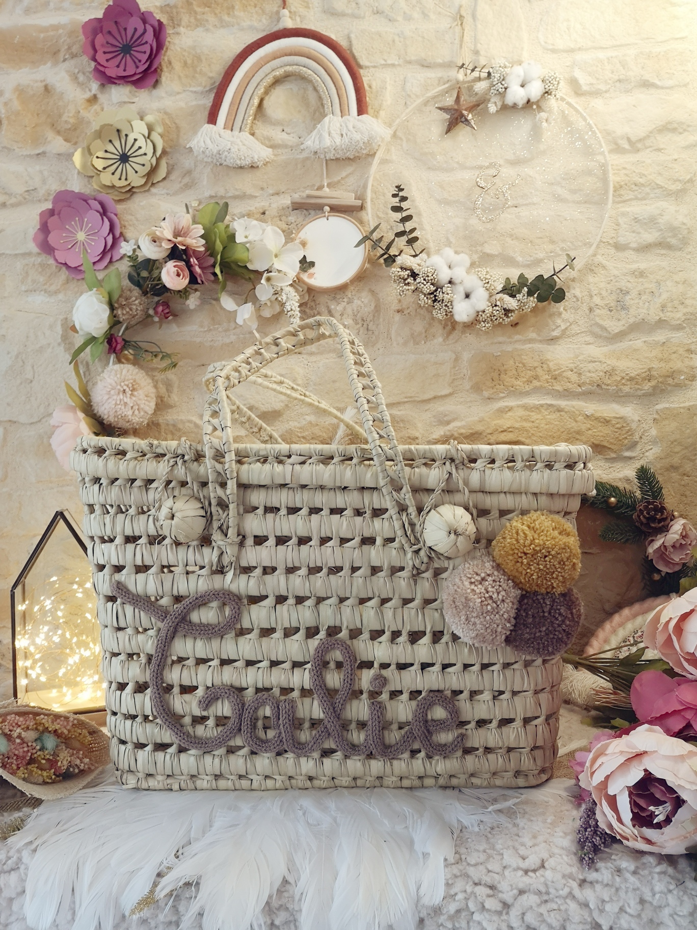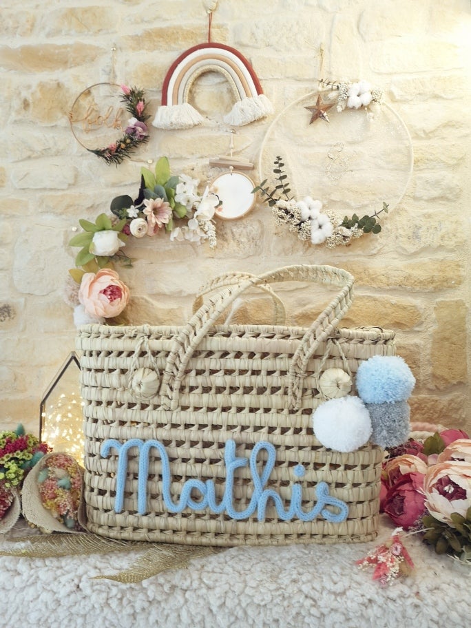 Prénom et pompons en laine pour un meilleur maintien. Article fait main qui peut présenter quelques variantes et irrégularités au rendu. Il y a deux variantes pour la fermeture de la malle : un ou deux boutons à accrocher, cela dépend des modèles et sera aléatoire en fonction de la commande.