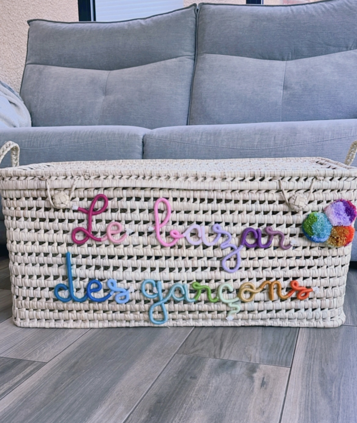 Malle à jouets XXL Le bazar des garçons Malle à jouets en feuille de palmier tressé rigide avec rabat pour la fermer. Idéal pour une chambre d’enfant ou une salle de jeu. Dimensions +/- 80cm de long, 32cm de large et 32cm de haut environ. Prénom et pompons en laine, macramé et fil métallisé (sécurisé) […]