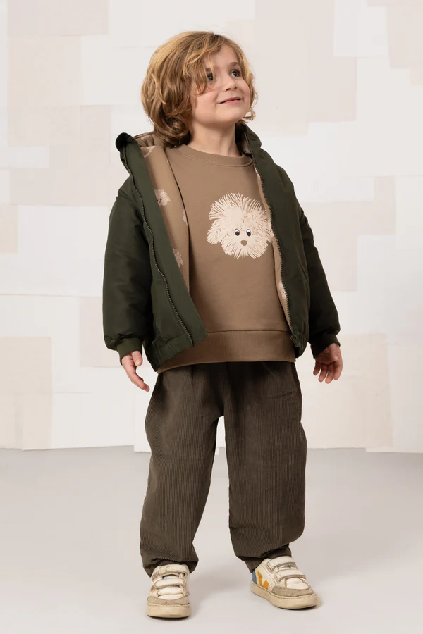 Ce manteau enfant imperméable séduit aussi par son style. Le coloris kaki intemporel s’associe facilement avec toutes les tenues. La doublure imprimée motif “Chien” apporte une touche ludique et signature. L’étiquette Studio Bohème cousue au dos affirme l’identité de la marque avec discrétion.