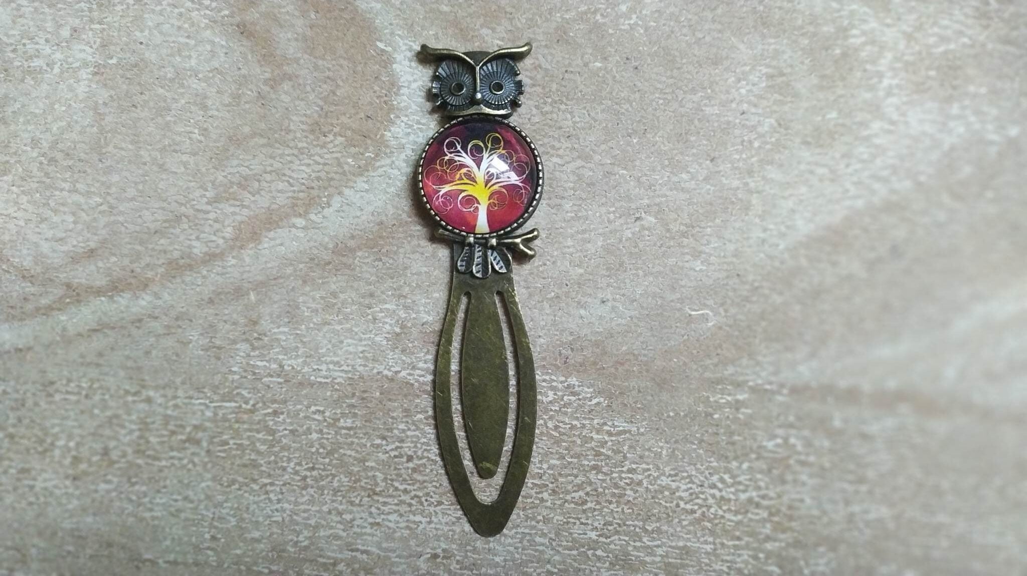 Le marque-page arbre de vie n°1 est une idée cadeau utile en plus d’être joli. Ce marque-page personnalisé est en acier couleur bronze antique, il est composé d’un mignon petit hibou posé sur une branche et dont le ventre est constitué d’un cabochon de verre bombé de 20 mm fait main. Tous les produits sont réalisés à la commande, un temps de fabrication de 48 heures est à prévoir.
