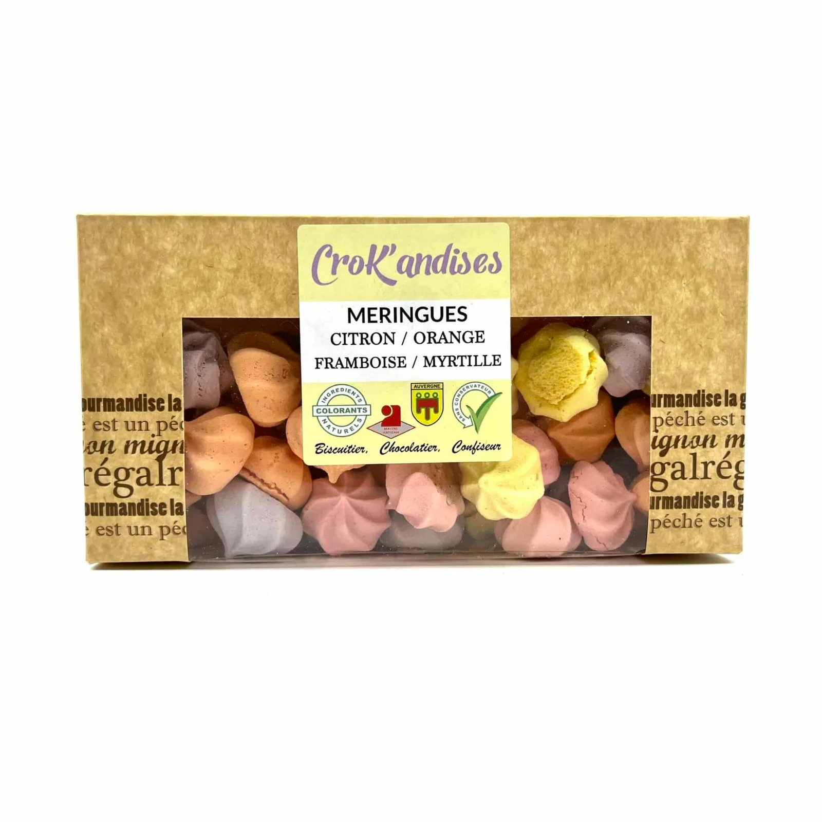 Quatuor de meringues artisanales Crok’andises aux saveurs citron, orange, framboise et myrtille. 70 g de douceur auvergnate colorée et parfumée naturellement.