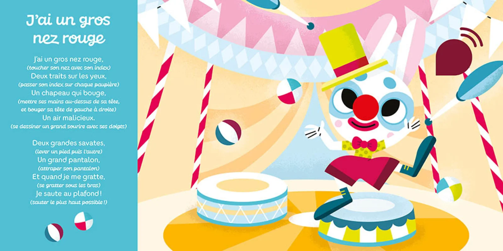 Les comptines sont mises en scène par des illustrations rondes, colorées et joyeuses, parfaitement adaptées aux jeunes enfants. De plus, ces images attirent le regard et renforcent l’envie d’interagir avec le livre. Par conséquent, l’expérience est à la fois visuelle, sonore et corporelle.
