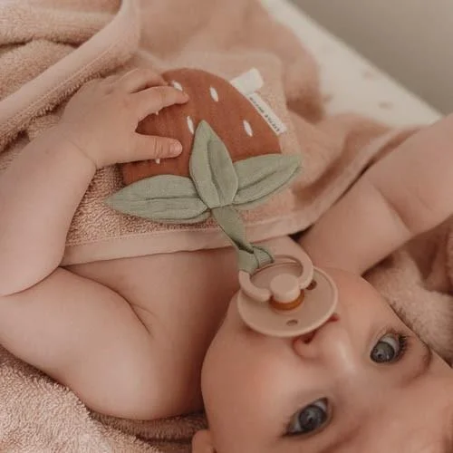 Grâce à son attache par nœud, vous pouvez y accrocher une sucette en un instant. Ainsi, ce petit doudou Fraise devient le compagnon parfait pour les promenades, les siestes ou les moments câlins, tout en évitant à la tétine de se perdre.