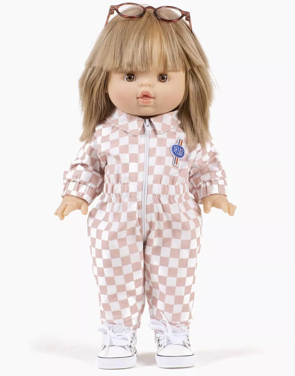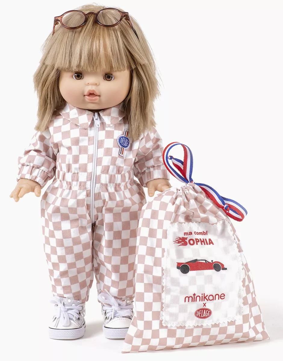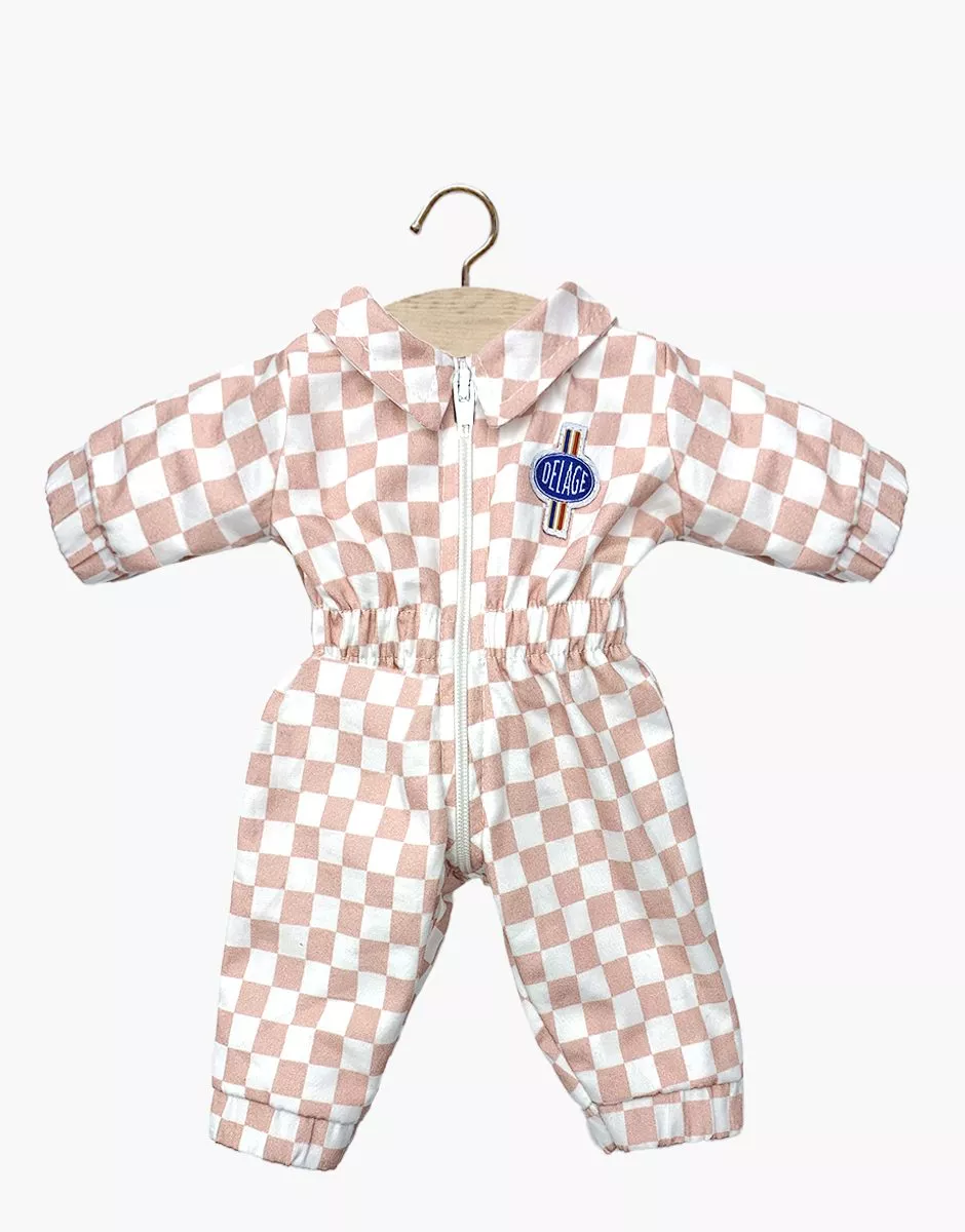 Collection Minikane X Delage – Combinaison Sophia à damier rose et blanc pour poupées Gordis 34 & 37cm. Vendue dans son pochon en coton motif damier. Design, développement & confection made in France. Design, development & tailoring made in France.