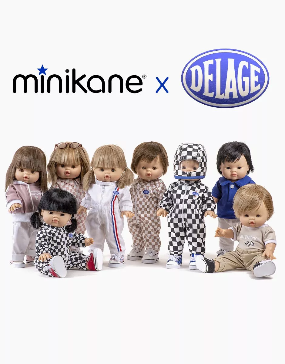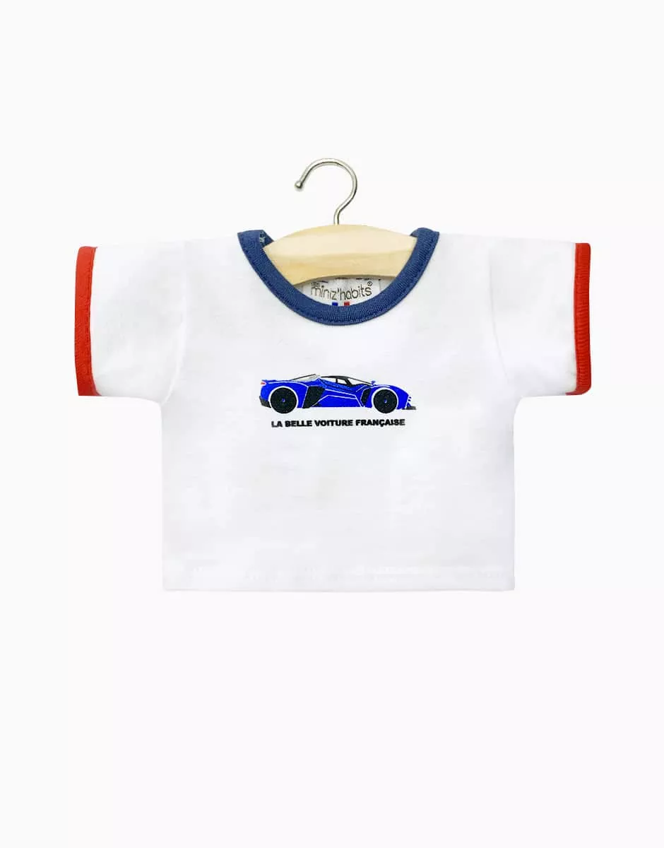 Collection Minikane X Delage – T-shirt Philippe en jersey blanc « La belle voiture française » avec manches bleu artic/rouge pour poupées et poupons Gordis 34 & 37cm. Design, développement & confection made in France. Design, development & tailoring made in France.
