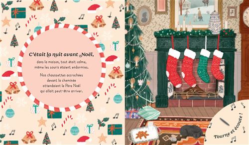 Page après page, l’enfant découvre la visite du Père Noël, la nuit étoilée, les rennes et les cadeaux qui emplissent la maison de joie. L’histoire, douce et poétique, s’accompagne d’une mélodie apaisante jouée par un boîtier musical mécanique à remontoir. Ce mécanisme ingénieux ne nécessite aucune pile et diffuse une berceuse pendant près de trois minutes.