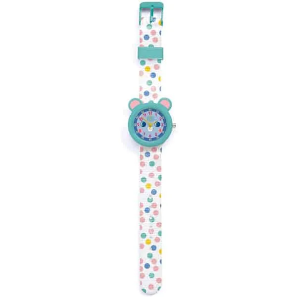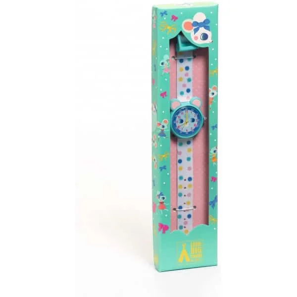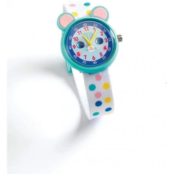 Une montre tout en douceur avec un adorable motif souris et un bracelet à pois, idéale pour apprendre l’heure dès 5 ans. Un accessoire ludique et résistant signé Djeco.