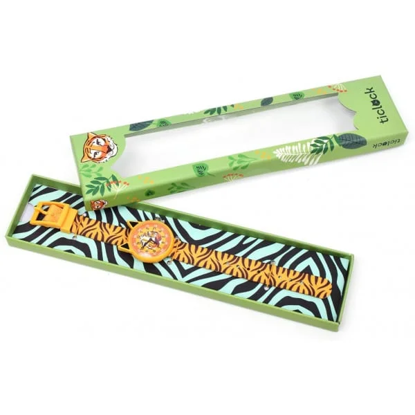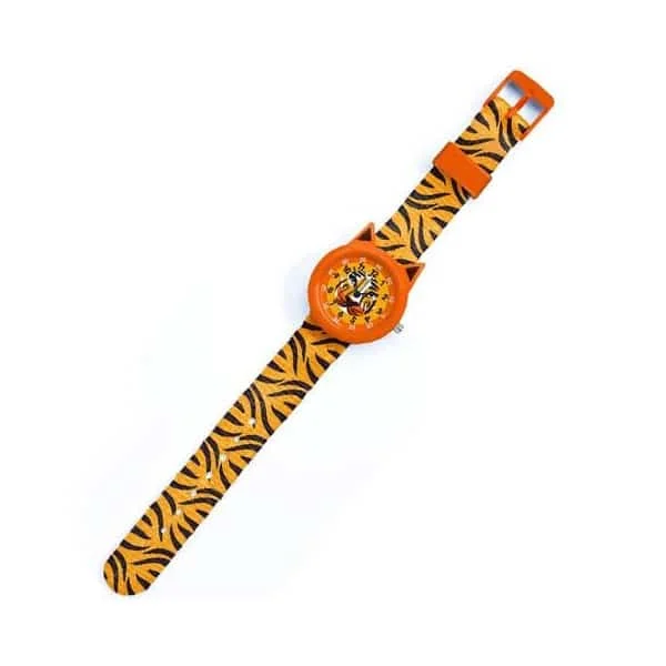 Son bracelet en polyester tout doux, aux motifs orange et noir façon pelage de tigre, en fait un véritable accessoire tendance. Sur le cadran, un adorable tigre accompagne les apprentis horlogers dans la découverte des heures et des minutes grâce à un affichage double clair et ludique.