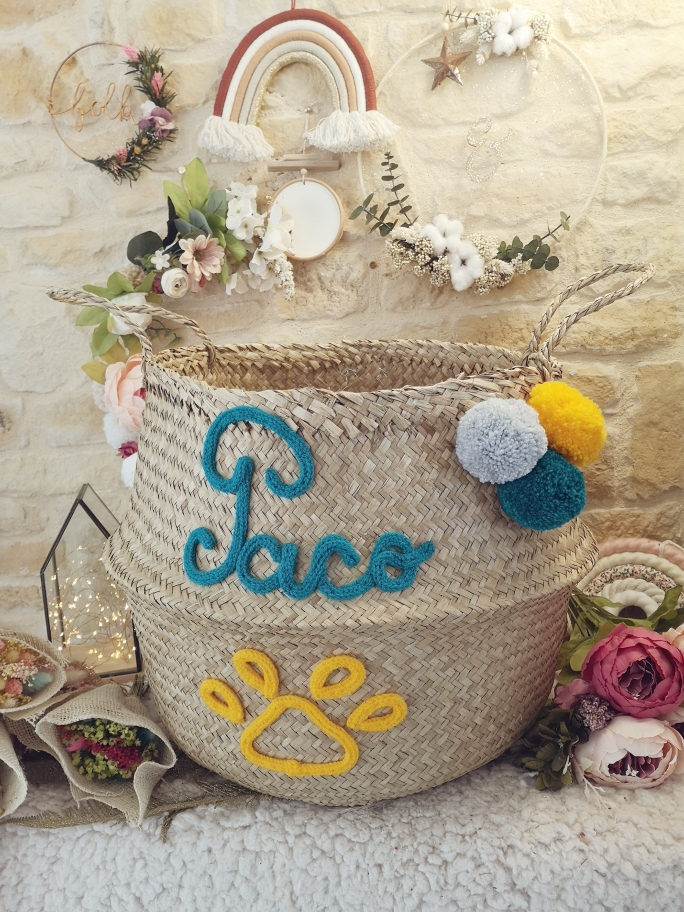 Panier à jouets chien avec patte et pompons grand modèle Petit Panier à jouets en bambou tressé souple et léger qui peut se plier sur lui-même. Idéal pour ranger tous les petits jouets de votre animal de compagnie. Dimensions environ 38cm de haut, 45cm diamètre au plus large, 36cm au plus haut. Prénom et patte […]