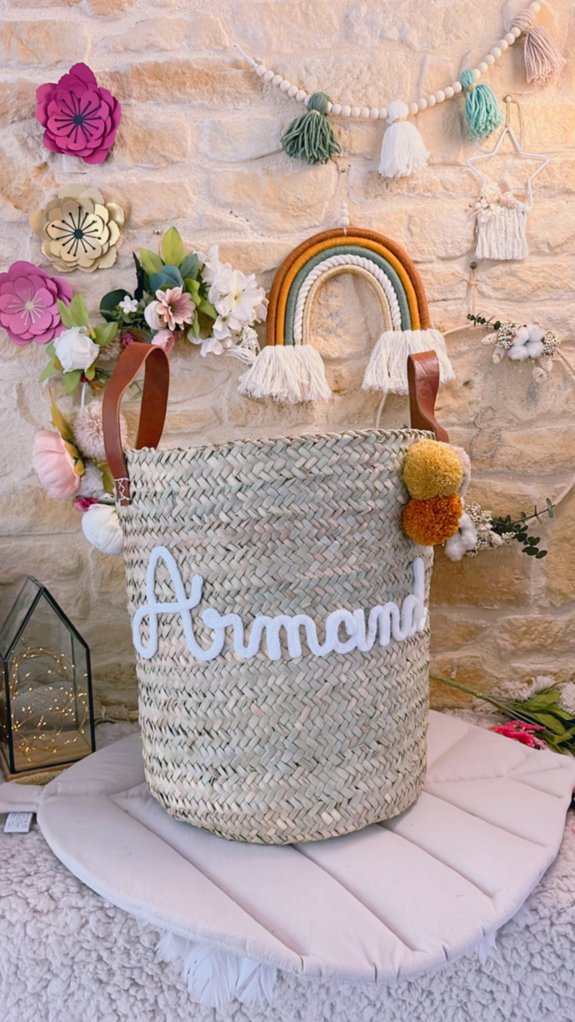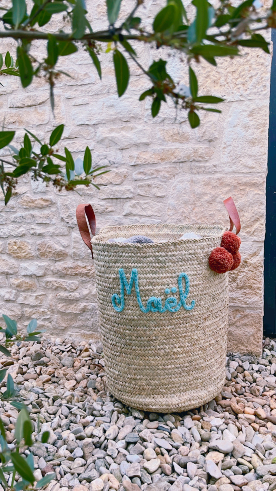 Prénom et pompons en laine, brodé à la main. Article fait main qui peut présenter quelques variantes et irrégularités au rendu. Anses en cuir véritable brodées par mes mains (issues de chutes de cuir de maroquinerie de luxe). Les couleurs peuvent avoir une légère variation entre l’écran et la réalité.