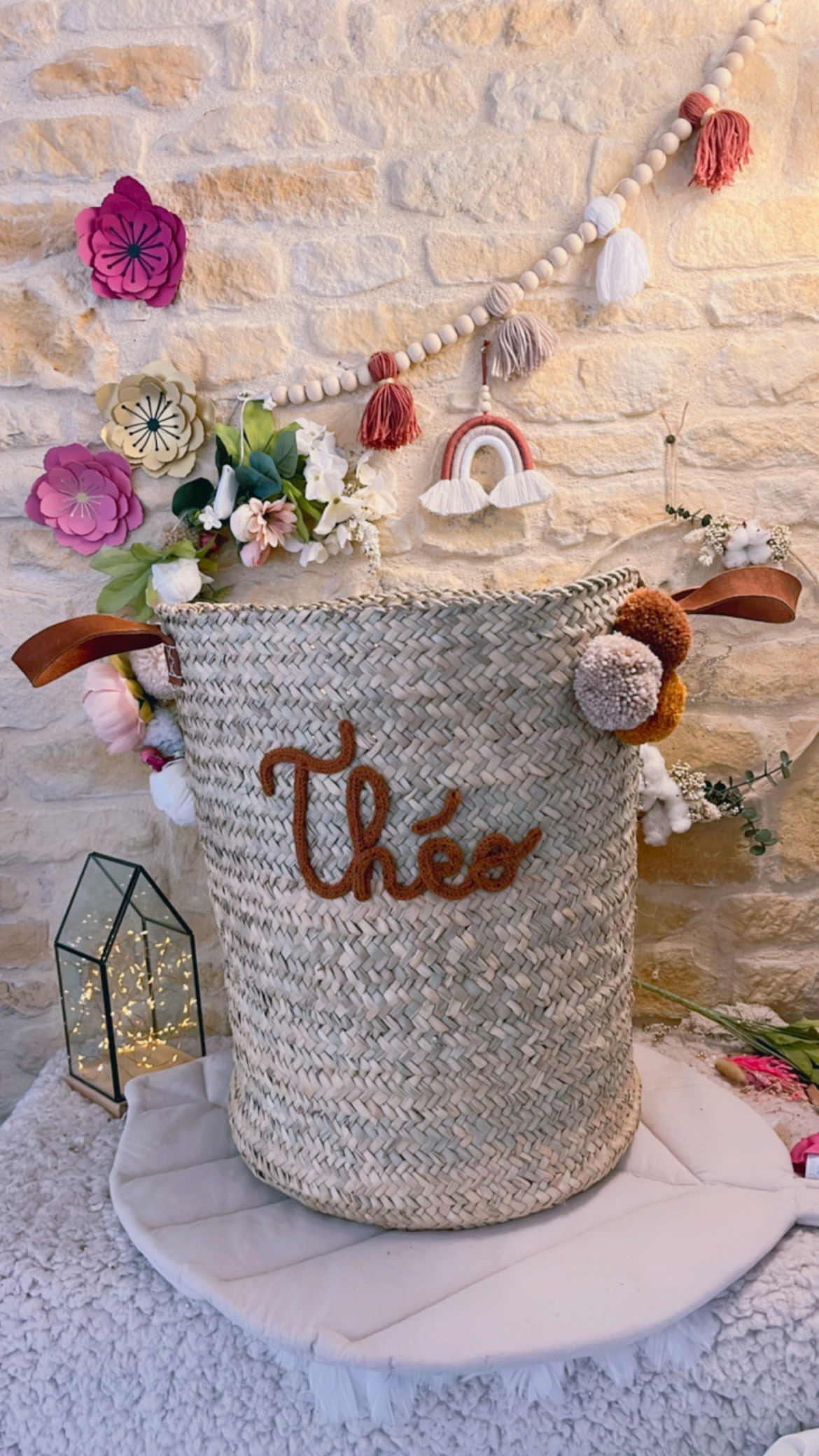 Panier à jouets modèle haut tressé anses en cuir avec pompons