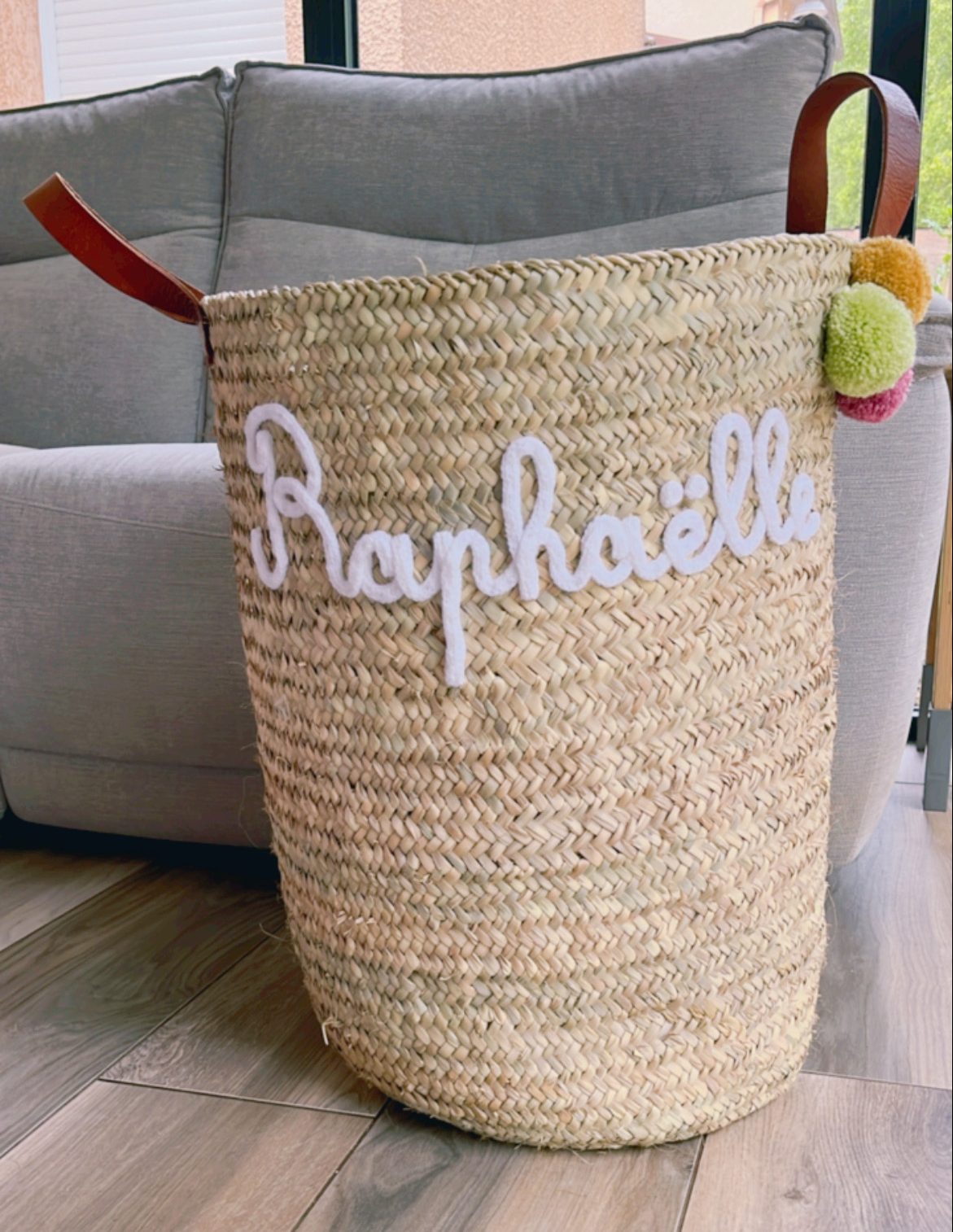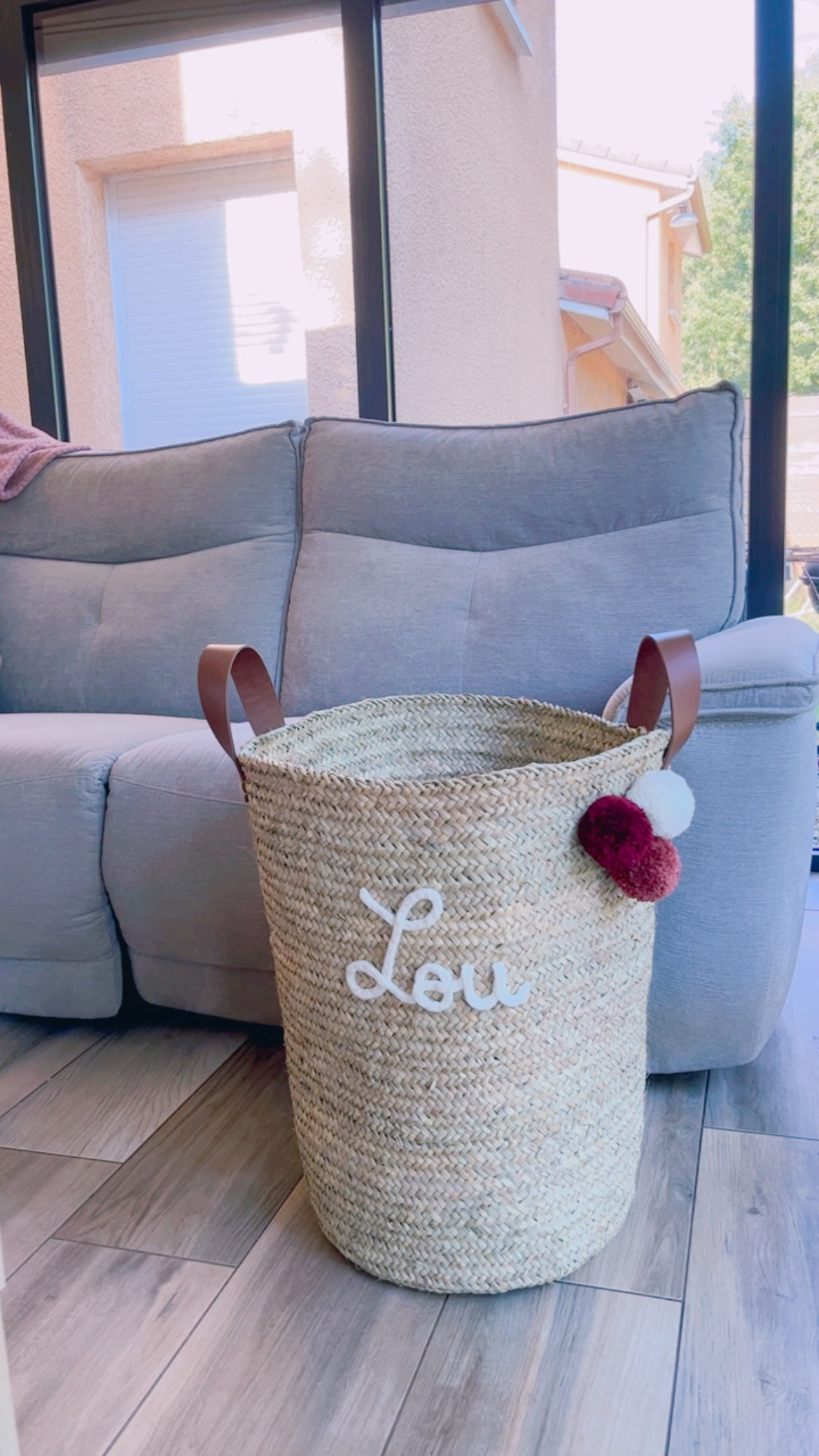 * Panier à jouets modèle haut tressé anses en cuir avec pompons