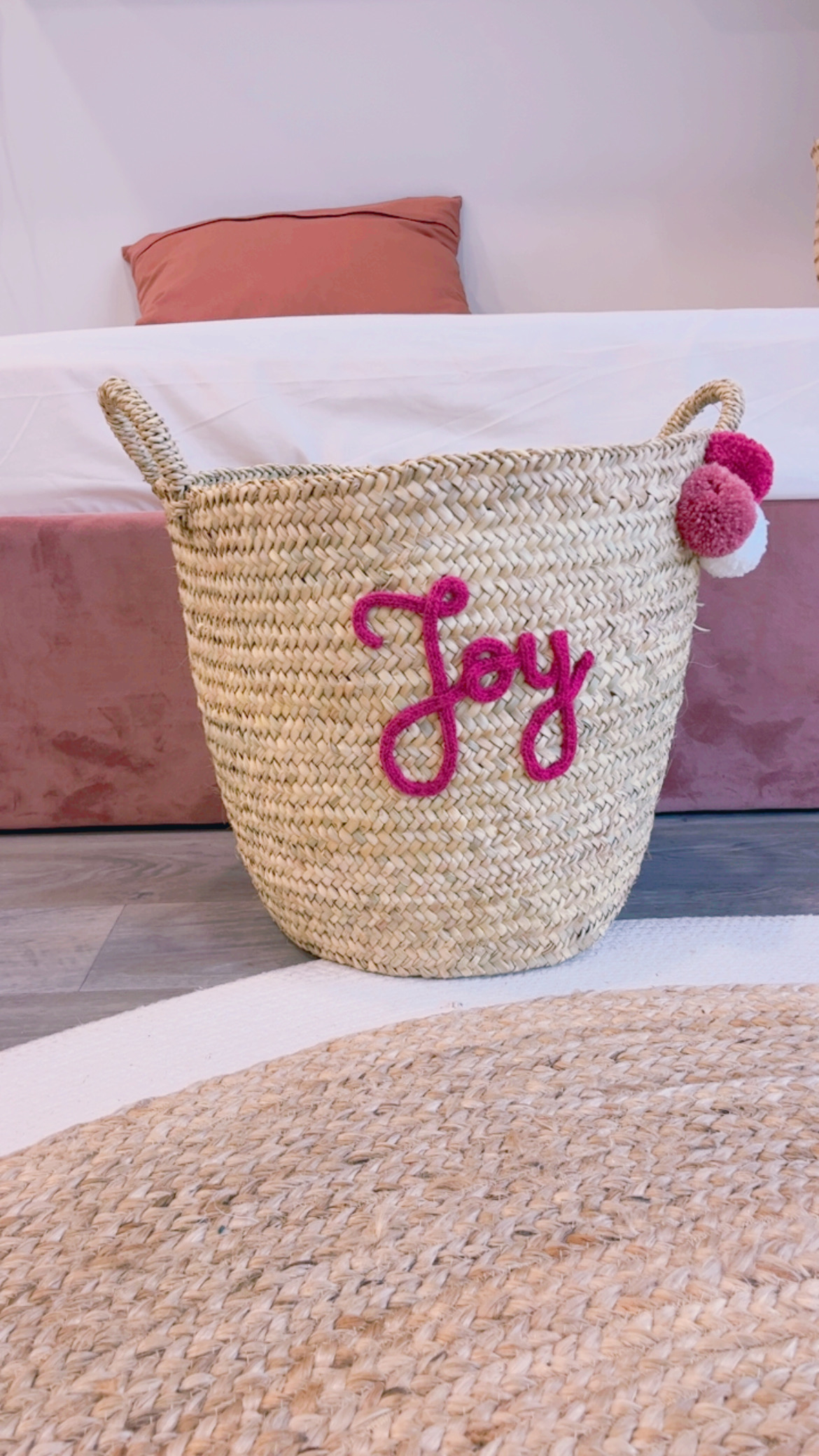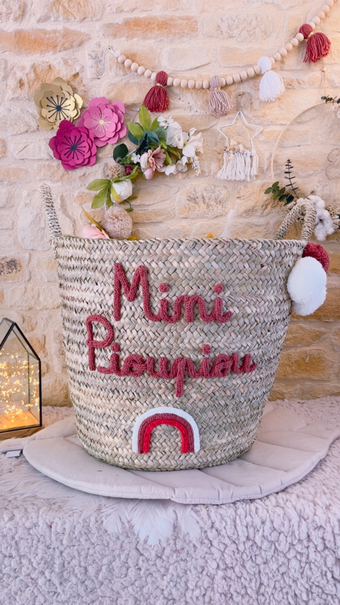 * Panier à jouets modèle haut tressé anses naturelles avec 3 pompons