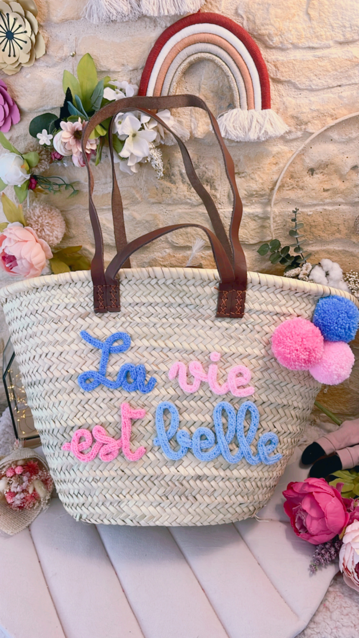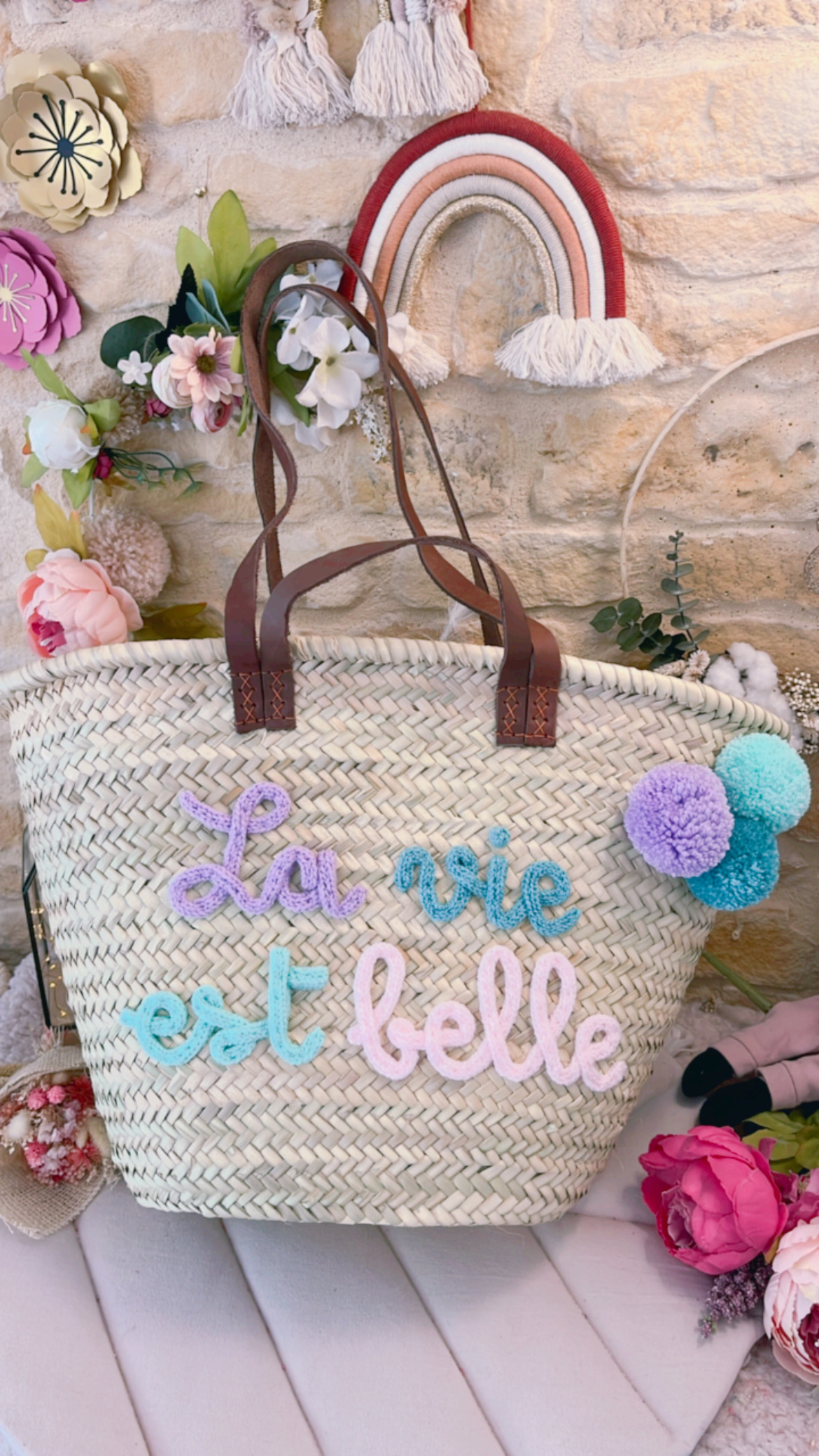 Panier de plage La vie est belle Grand panier en feuille de palmier tressé rigide. Dimensions 50cm de long au plus haut, 30 cm de long au plus bas, 35cm de haut et 22cm de large Prénom et pompons en laine, brodé à la main. Texte La vie est belle Double anses en cuir Les couleurs peuvent varier […]