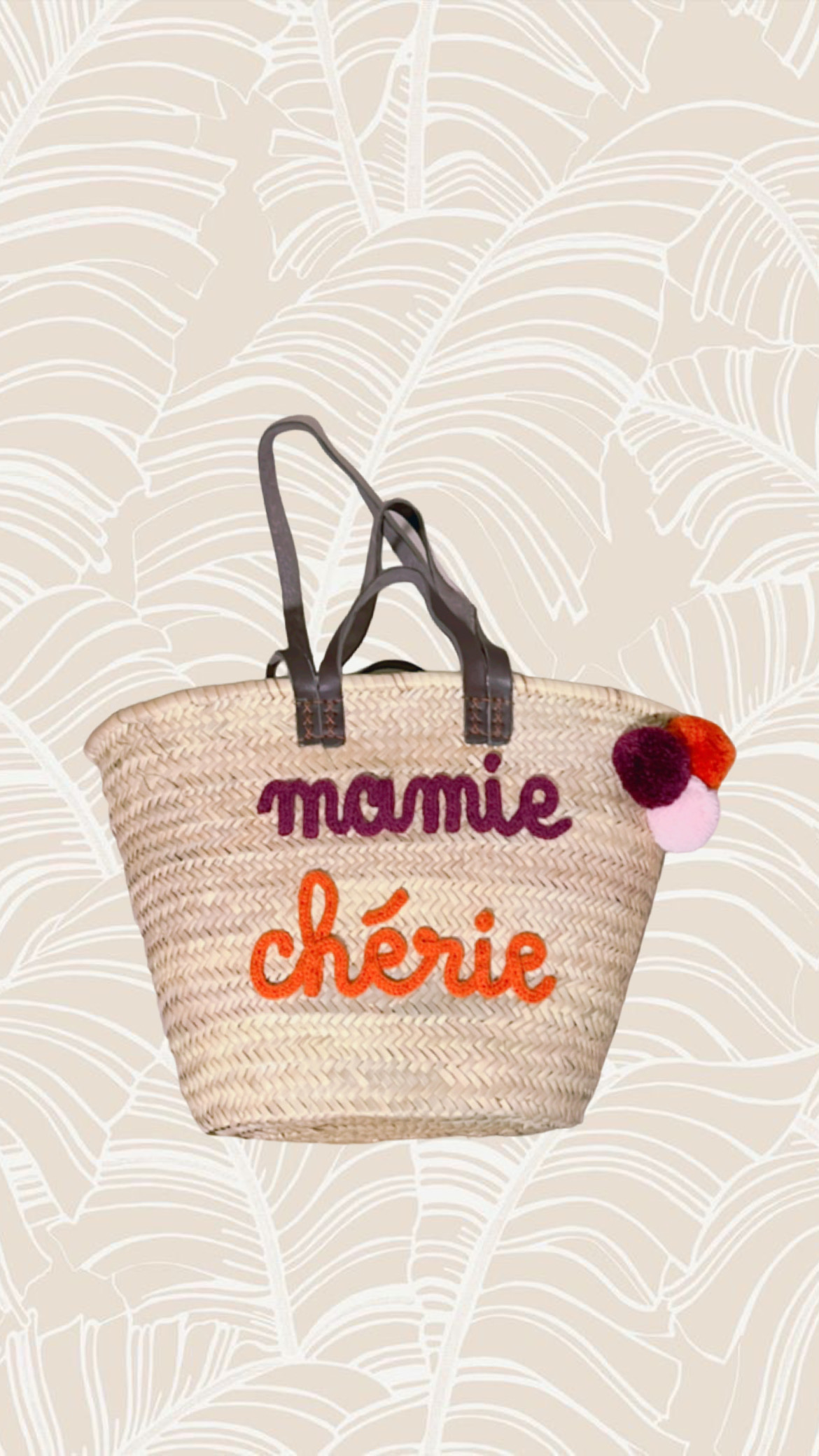 Panier de plage mamie chérie double anses Grand panier de plage en feuille de palmier tressé rigide. Brodé mamie chérie à la main. Dimensions 50cm de long au plus haut, 30 cm de long au plus bas, 35cm de haut et 22cm de large Prénom et pompons en laine, brodé à la main. Texte : mamie chérie. […]
