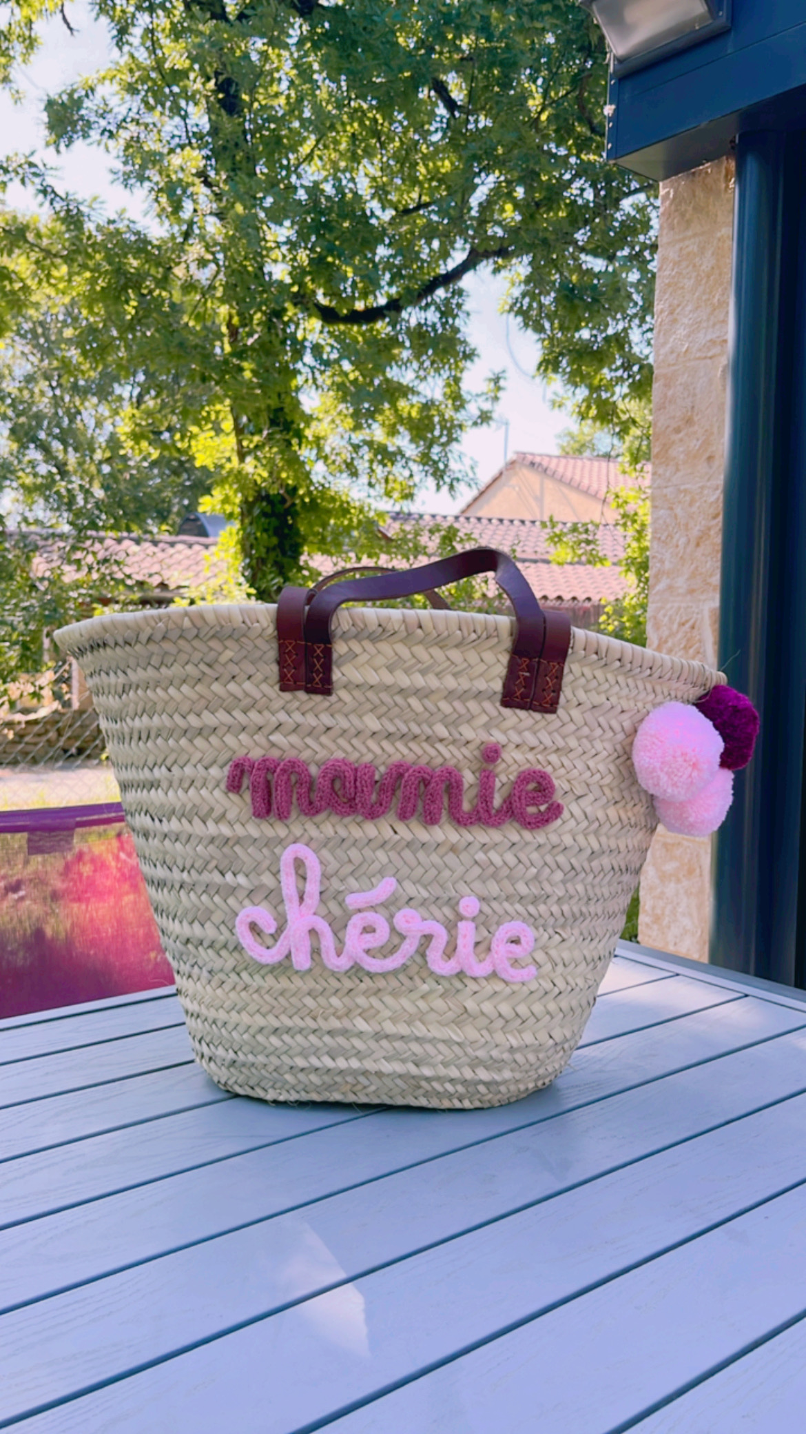 Grand panier de plage en feuille de palmier tressé rigide. Brodé mamie chérie à la main.