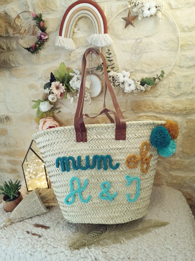 Grand panier de plage en feuille de palmier tressé rigide. Brodé mum of et les initiales des enfants à la main.