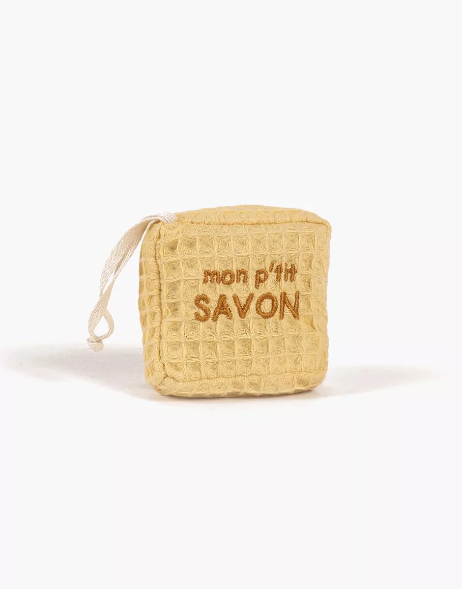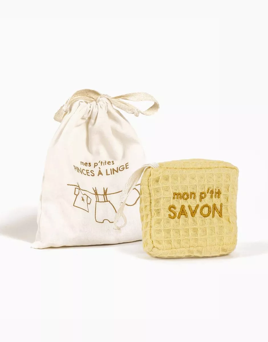 « Set lingerie » composé d’un savon en nid d’abeille vanille brodé et d’un pochon en coton écru avec ses 10 pinces à linge. Design, développement & confection made in France. 100% cotton, sold alone (no accessories). Design, development & tailoring made in France.
