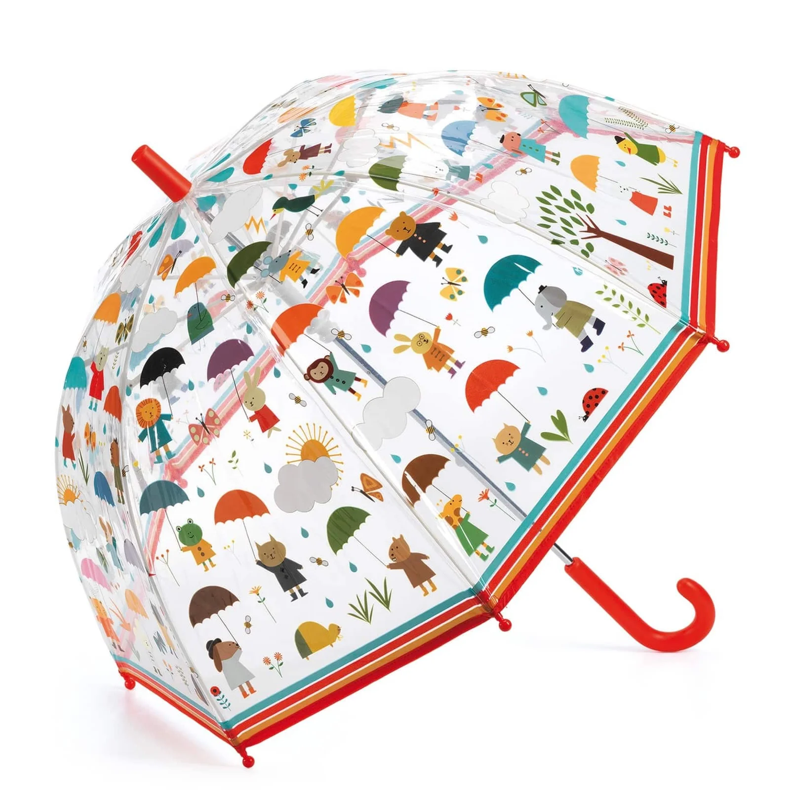 Parapluie Sous La Pluie, Djeco. Un parapluie coloré avec de ravissantes illustrations. La structure souple et résistante est en fibre de verre.