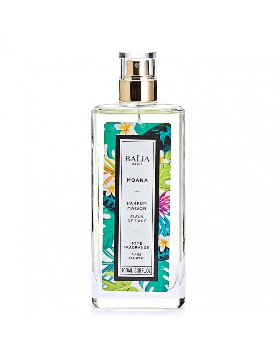 Parfum Maison Moana 100ml, Baïja. Rigoureusement sélectionnées auprès des meilleurs parfumeurs de Grasse, il dévoile ses douces notes de Vanille, Noix de coco et Fleur de Tiaré. Quelques vaporisations dans l’air ambiant suffisent pour diffuser ce doux melange entre la fleur et le fruit.