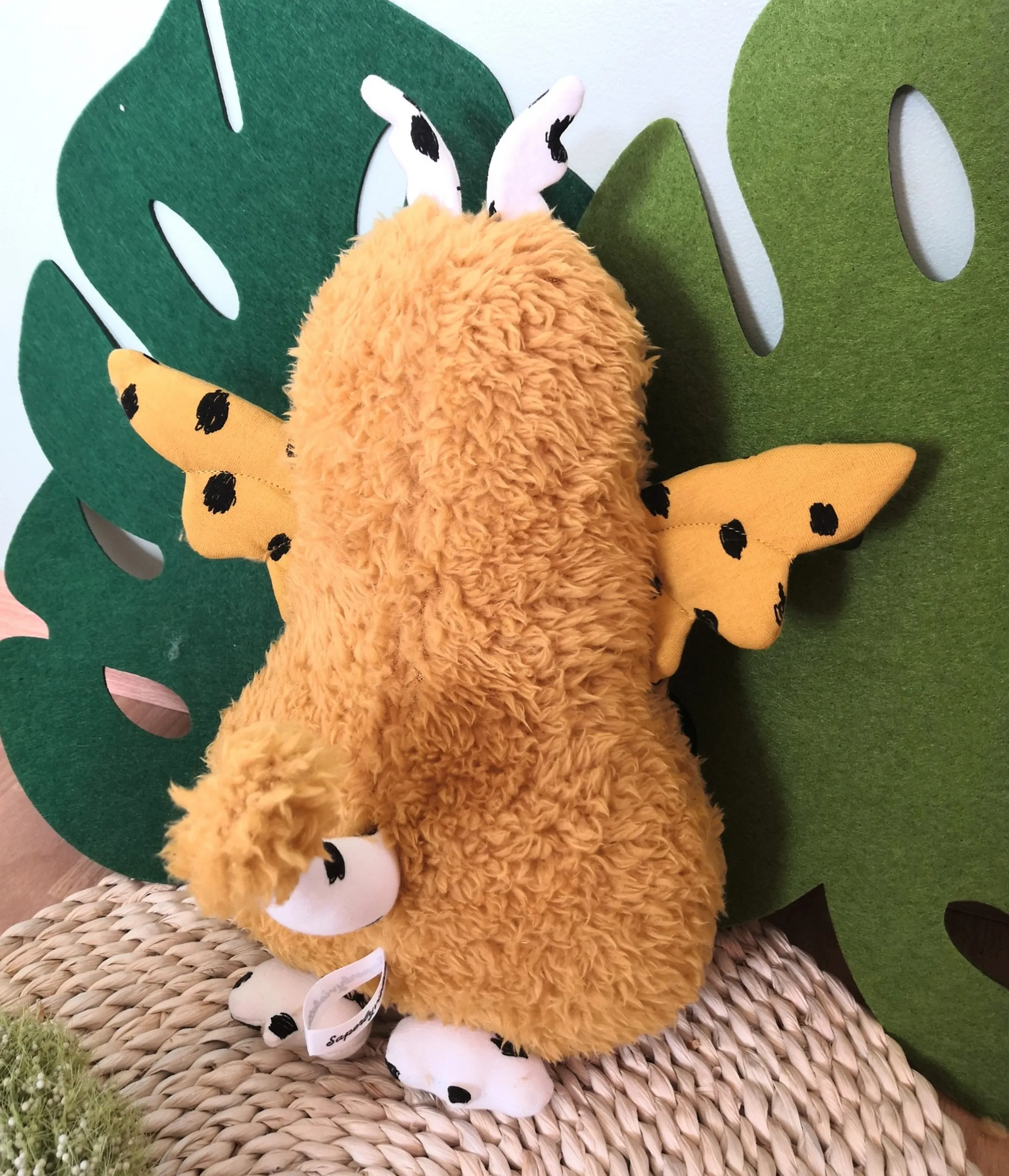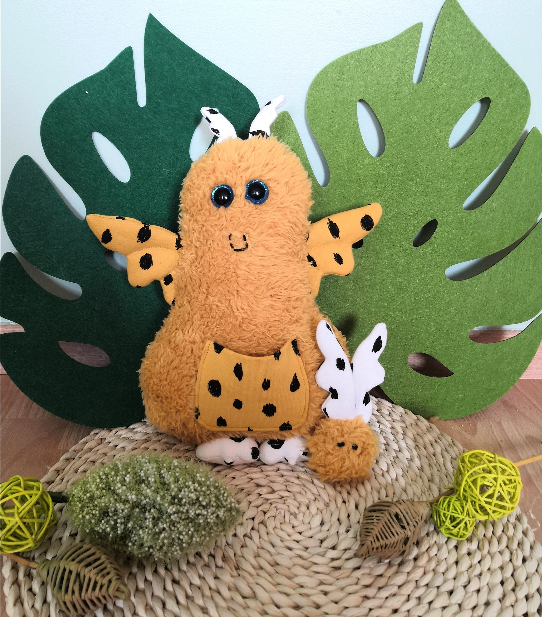 Le “Fripouillou” est une créature espiègle et friponne récemment arrivée chez Saperlyviolette. Les Papouillous ont vite adoptée cette peluche rigolote dans leur cocon. D’une belle couleur jaune moutarde elle ravira aussi bien les petites filles que les petits garçon. Ils adoreront particulièrement son petit bébé à glisser dans sa poche ventrale ou encore agripper ses ailes.