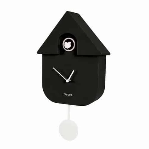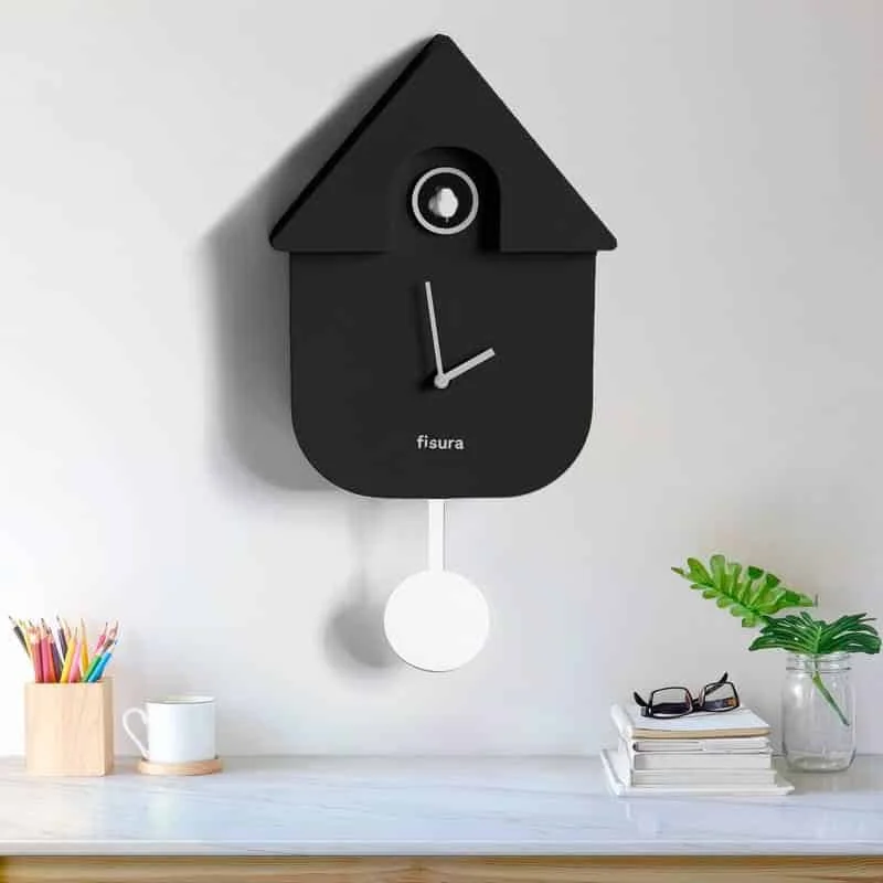 Pendule Murale Coucou Maison Noire, Fisura. Pendule murale pour salon, cuisine ou chambre. Le coucou chante toutes les heures, offrant un son lyrique, tamisé et ambiant…! La pendule peut également être  silencieuse, elle est donc parfaite pour n’importe quelle pièce de la maison.