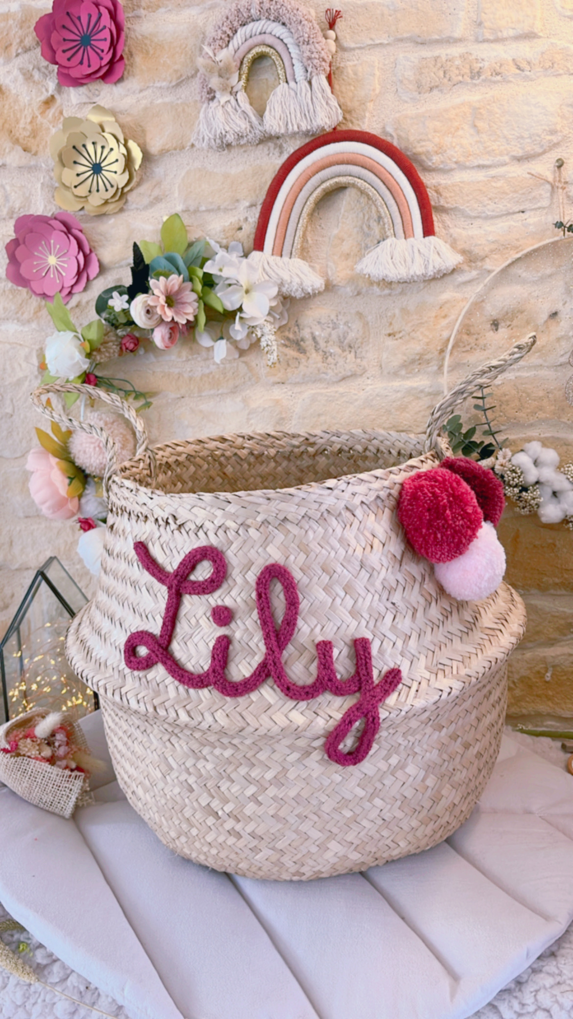 Petit Panier à jouets modèle tressé avec pompons Petit panier à jouets en feuille de palmier tressé souple et léger qui peut se plier sur lui-même. Idéal pour une chambre d’enfant ou une salle de jeu. Dimensions 30cm de haut, 40cm diamètre au plus large. Prénom et pompons en laine, brodé à la main. Article […]