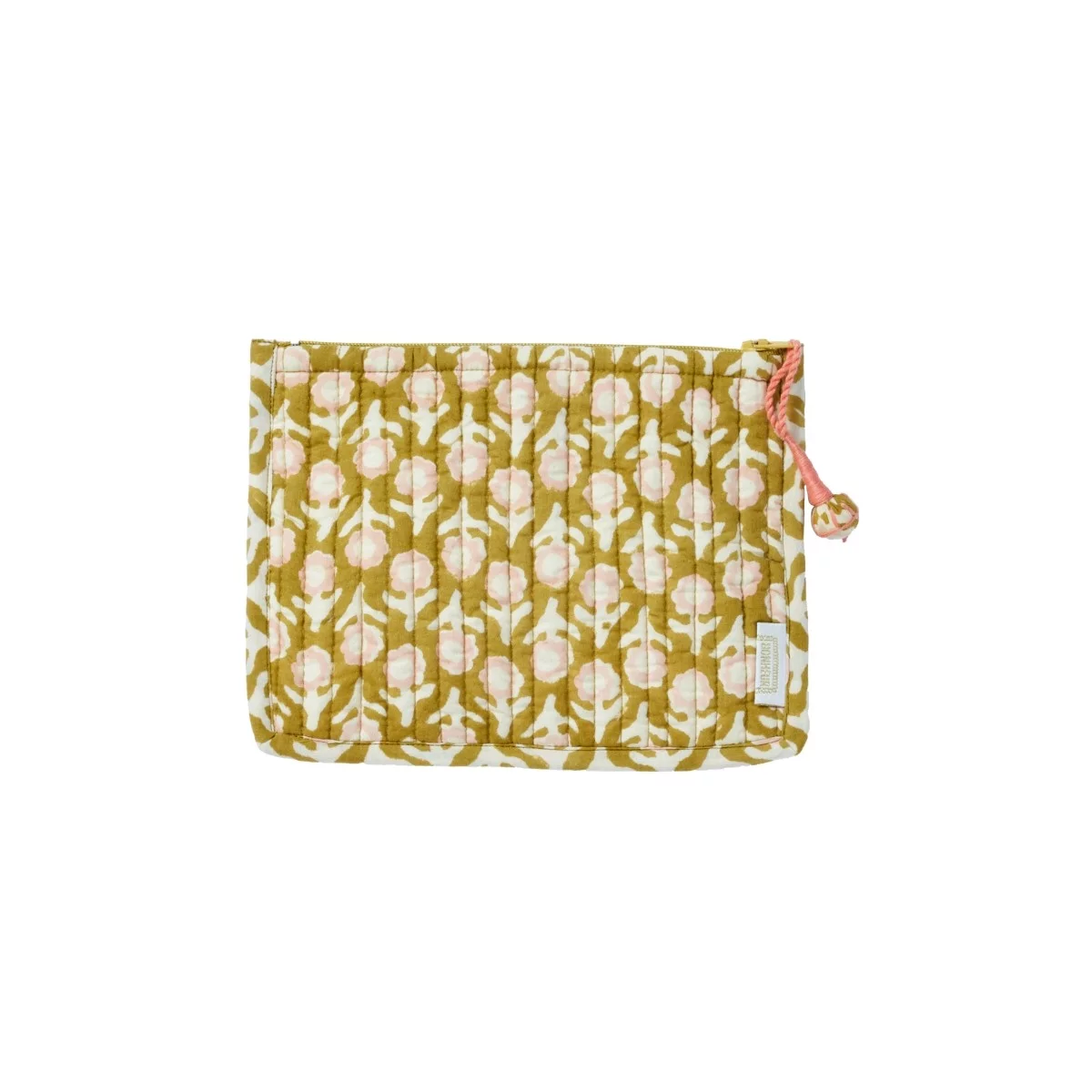 La petite pochette indispensable du quotidien. À glisser dans un sac à main, un tote bag, un sac week-end pour y ranger make-up, bijoux, papiers, ou petits trésors. Imprimée à la main en block print, elle allie douceur, fonctionnalité et touche artisanale. Matelassée, doublée en coton et ornée d’un pompon fait main, elle a tout pour plaire. On aime : son format parfait, sa légèreté et son imprimé unique, à offrir ou à s’offrir. Détails : Fermeture zippée invisible Matelassage moelleux à surpiqûres verticales Doublure coton Pompon fait main Popeline 100 % coton – ouatinage 100 % polyester