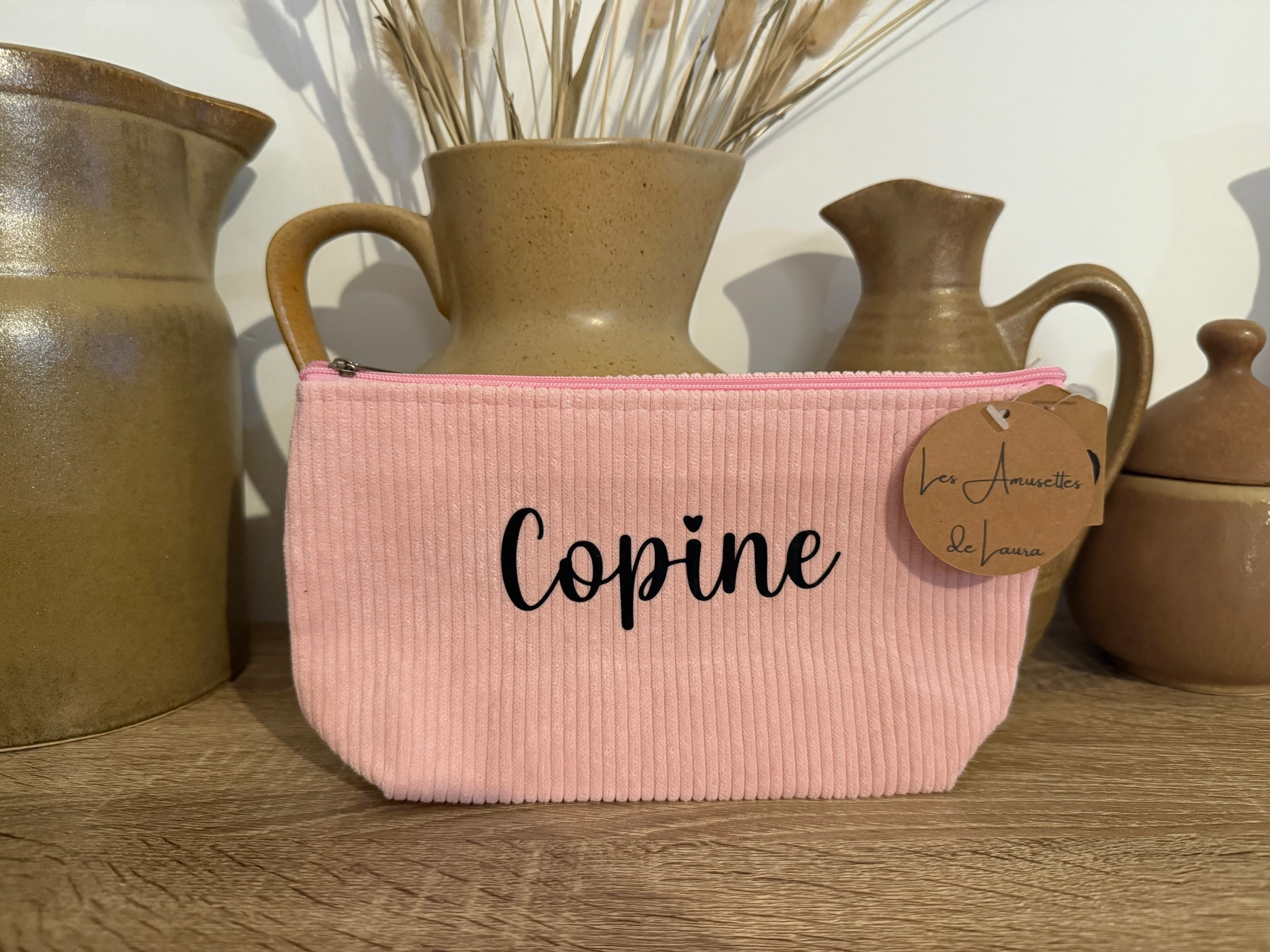 Pochette en velours côtelé Rose et écriture « Copine » noire Dimension 21x12x7 cm Fermeture éclaire Possibilité de personnaliser sur demande