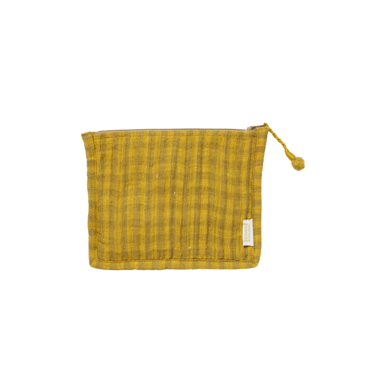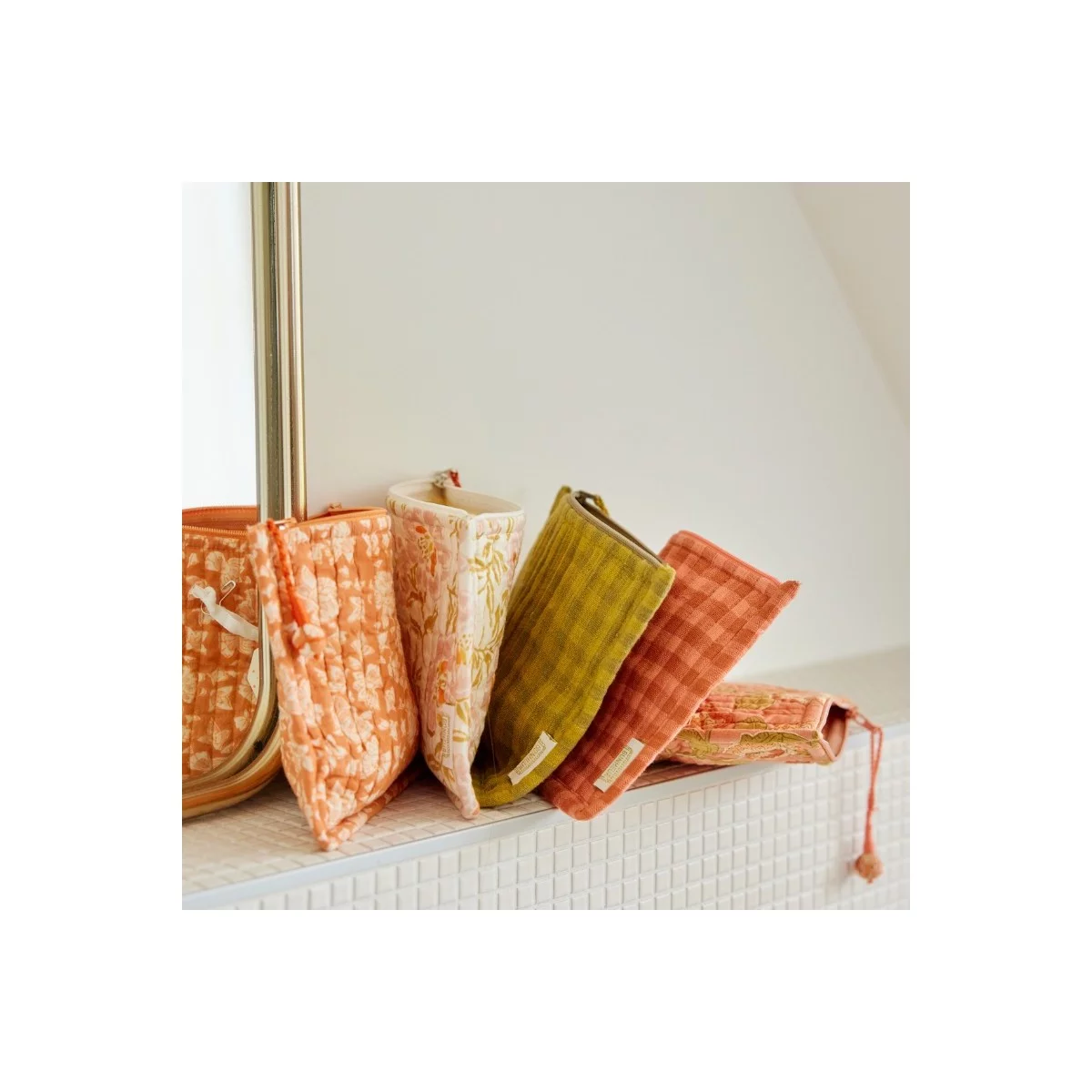 La petite pochette indispensable du quotidien. À glisser dans un sac à main, un tote bag, un sac week-end pour y ranger make-up, bijoux, papiers, ou petits trésors. Imprimée à la main en block print, elle allie douceur, fonctionnalité et touche artisanale. Matelassée, doublée en coton et ornée d’un pompon fait main, elle a tout pour plaire. On aime : son format parfait, sa légèreté et son imprimé unique, à offrir ou à s’offrir. Détails : Fermeture zippée invisible Matelassage moelleux à surpiqûres verticales Doublure coton Pompon fait main Popeline 100 % coton – ouatinage 100 % polyester