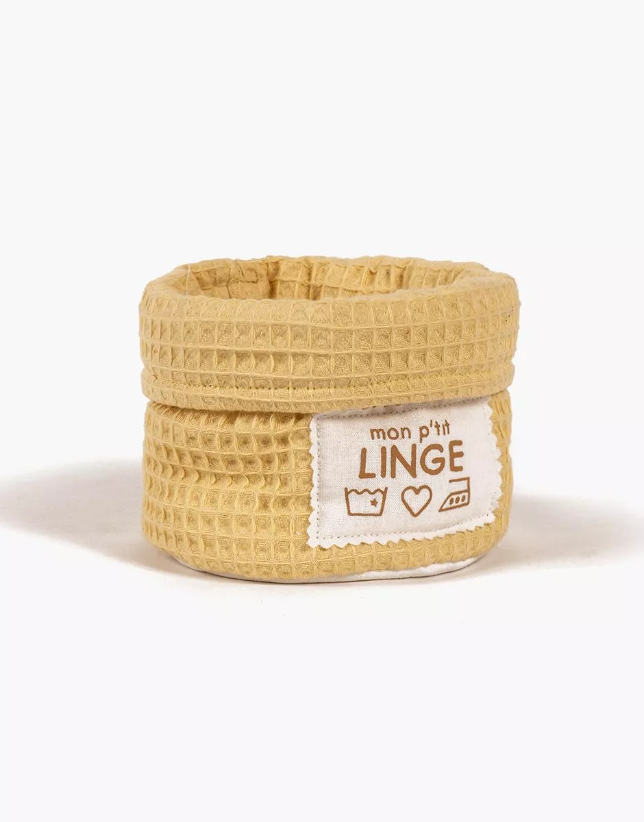 Panier en nid d’abeille vanille avec sérigraphie « Mon p’tit linge ». Vendu seul sans accessoire. Dimensions : Diamètre 14 cm x Hauteur 10cm. Design, développement & confection made in France. 100% cotton dolls basket, sold alone (no accessories). Bag size (L x W x D) : 14cm x 14cm x 10cm. Design, development & tailoring made in France.
