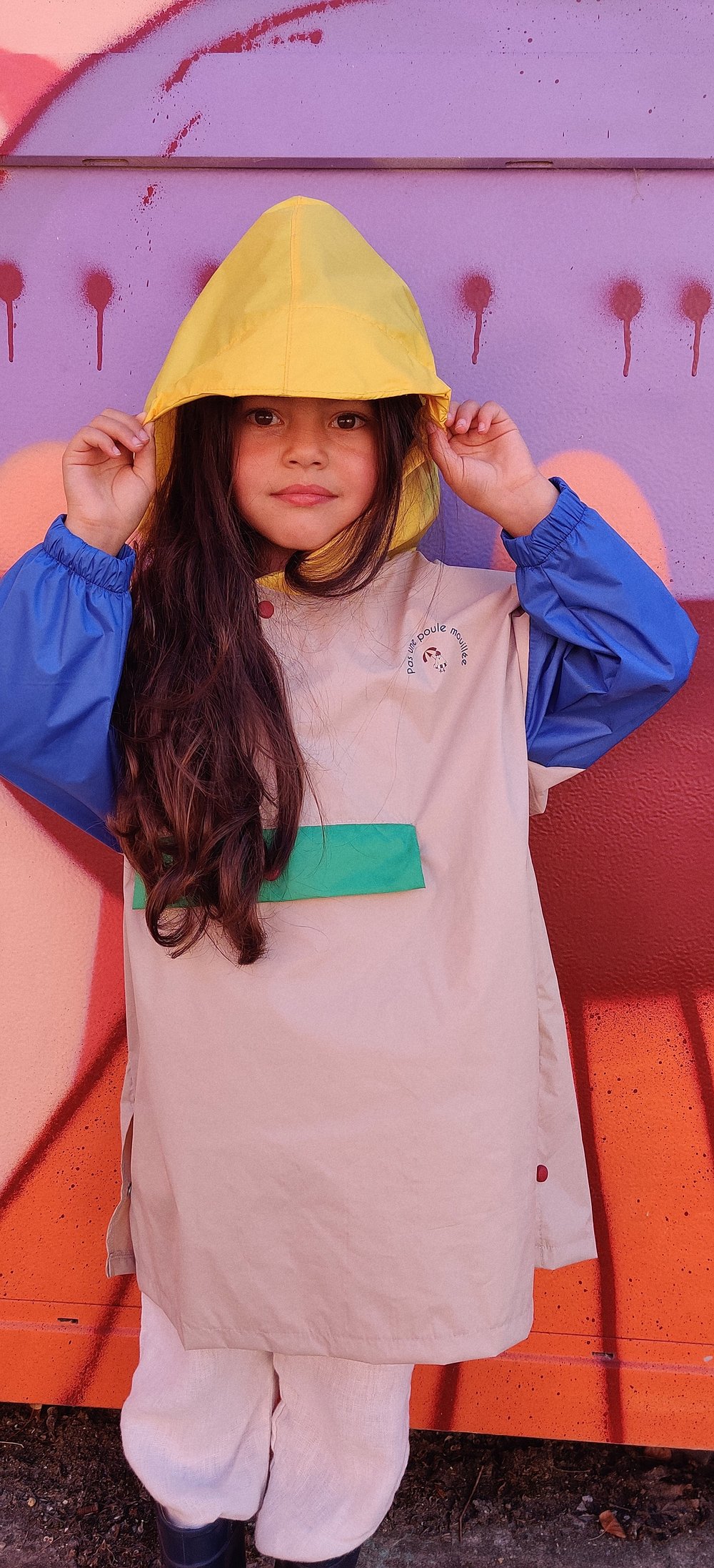Ne soyez plus une poule mouillée avec le poncho de pluie à la capuche jaune de Poule Party. Un accessoire à la fois stylé, écoresponsable et fabriqué en Europe à partir de matériaux recyclés. Conçu pour plaire tant aux parents qu’aux enfants. Le poncho offre une protection optimale contre la pluie tout en ajoutant une touche de couleur et de gaieté à vos journées pluvieuses. Un poncho de pluie écoresponsable et évolutif.