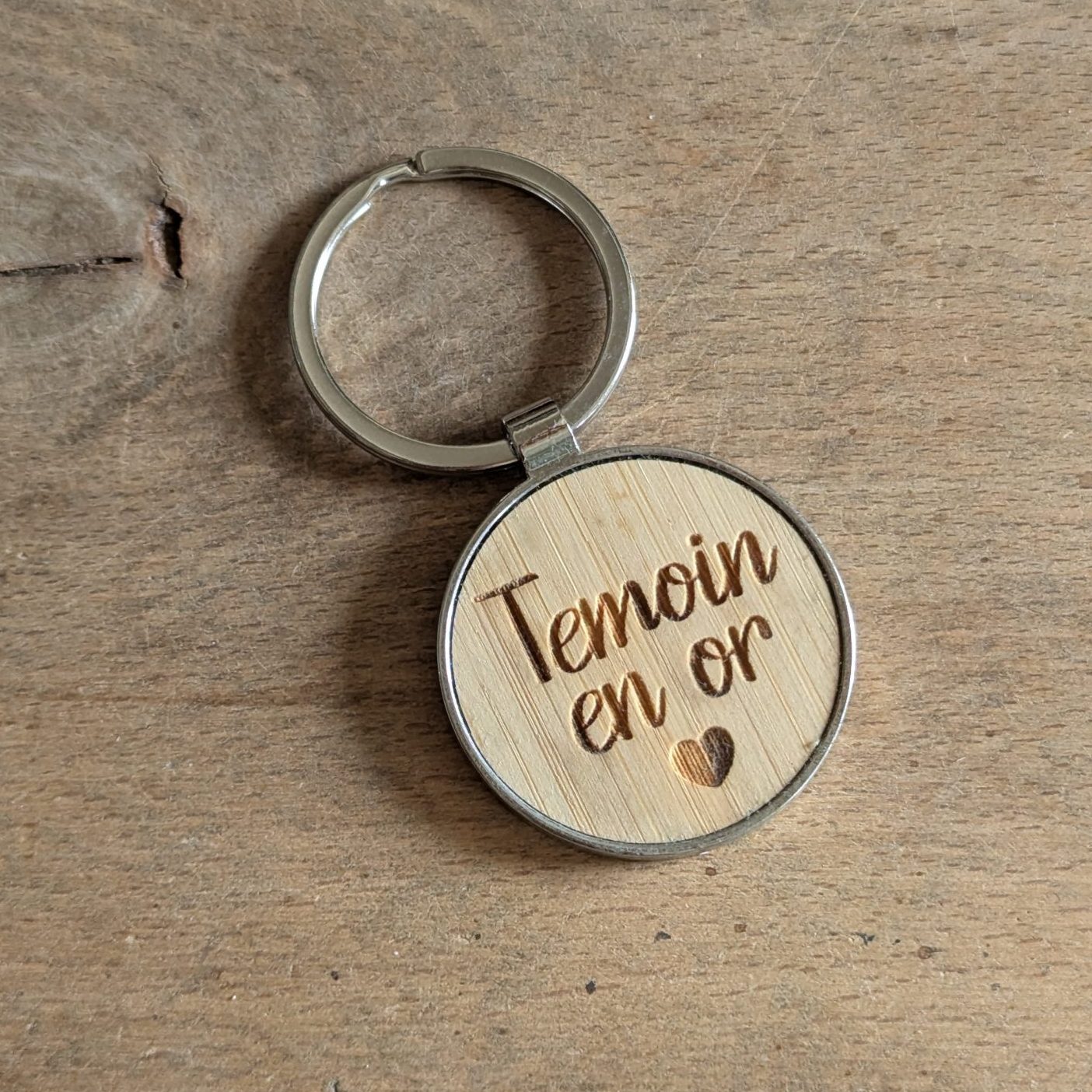 En métal et en bambou, ce porte-clés a été dessiné et gravé dans mon atelier, en Savoie. Format : diamètre 4 cm