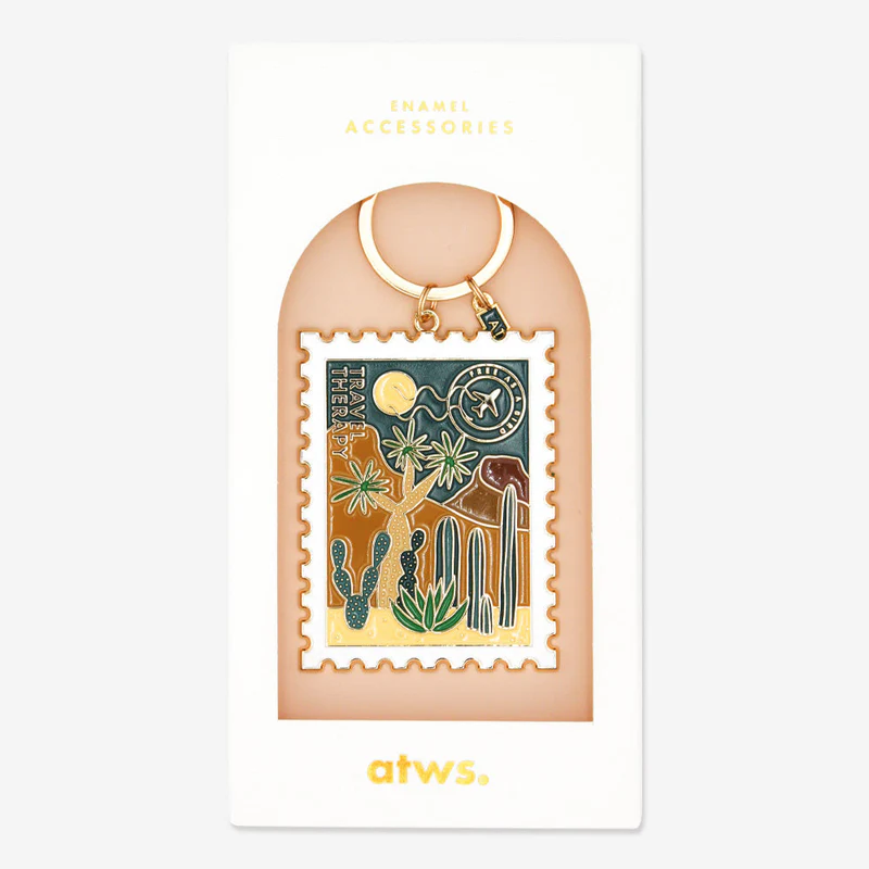 Le porte-clés Travel Therapy Grand Canyon est un clin d’œil élégant aux grands espaces et à l’envie d’ailleurs. Avec son illustration inspirée des paysages iconiques de l’Ouest américain et sa finition en émail doré, il ajoute une touche d’évasion et de raffinement à vos clés, sacs ou trousses.