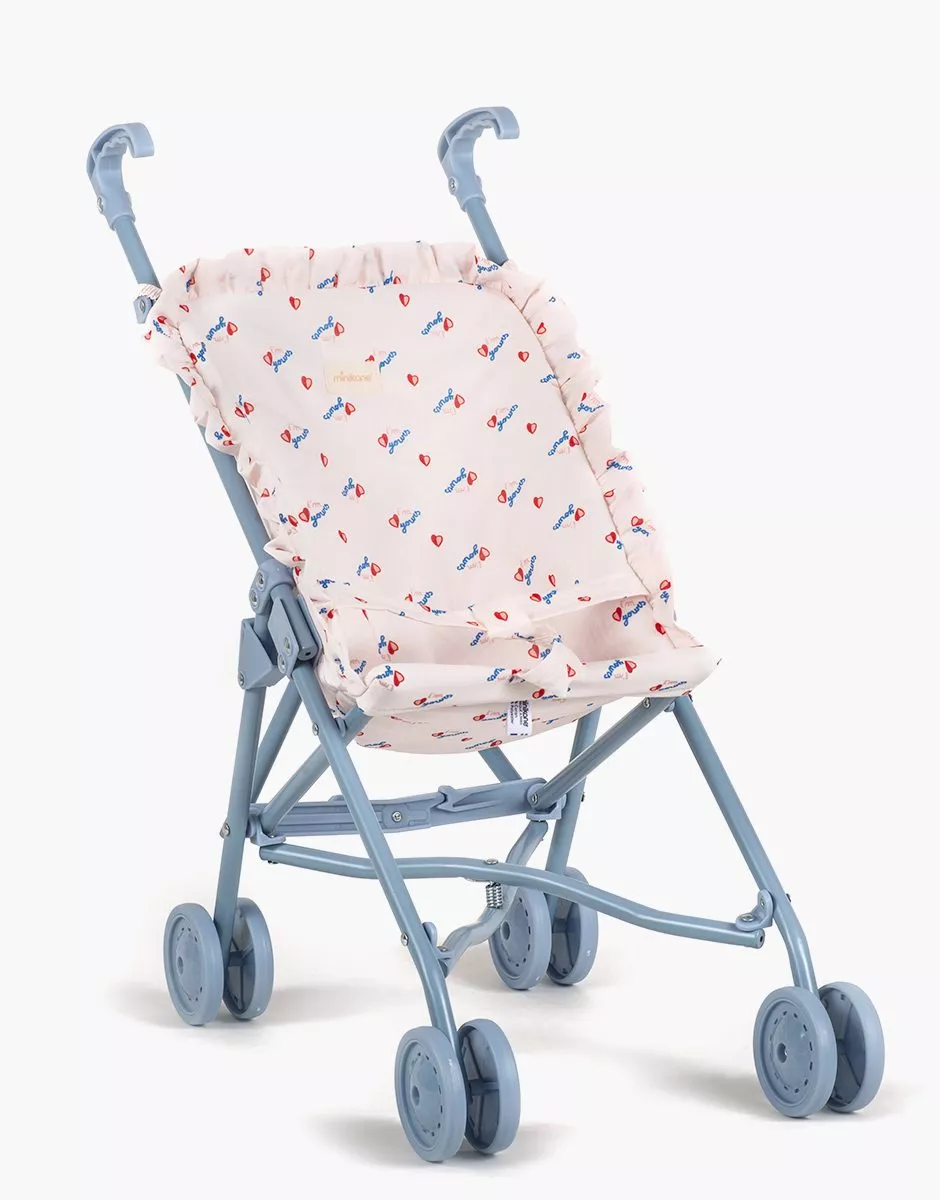 Poussette pliable pour poupée avec assise en coton à volants. Dimensions pliée : Longueur 63cm x Largeur 11cm x Hauteur 11cm. Dimensions dépliée : Longueur 42cm x Largeur 28cm x Hauteur 55cm. Châssis : bleu intégral. Design, développement & confection de l’assise MADE IN FRANCE. Design, development & manufacturing of the seat MADE IN FRANCE.