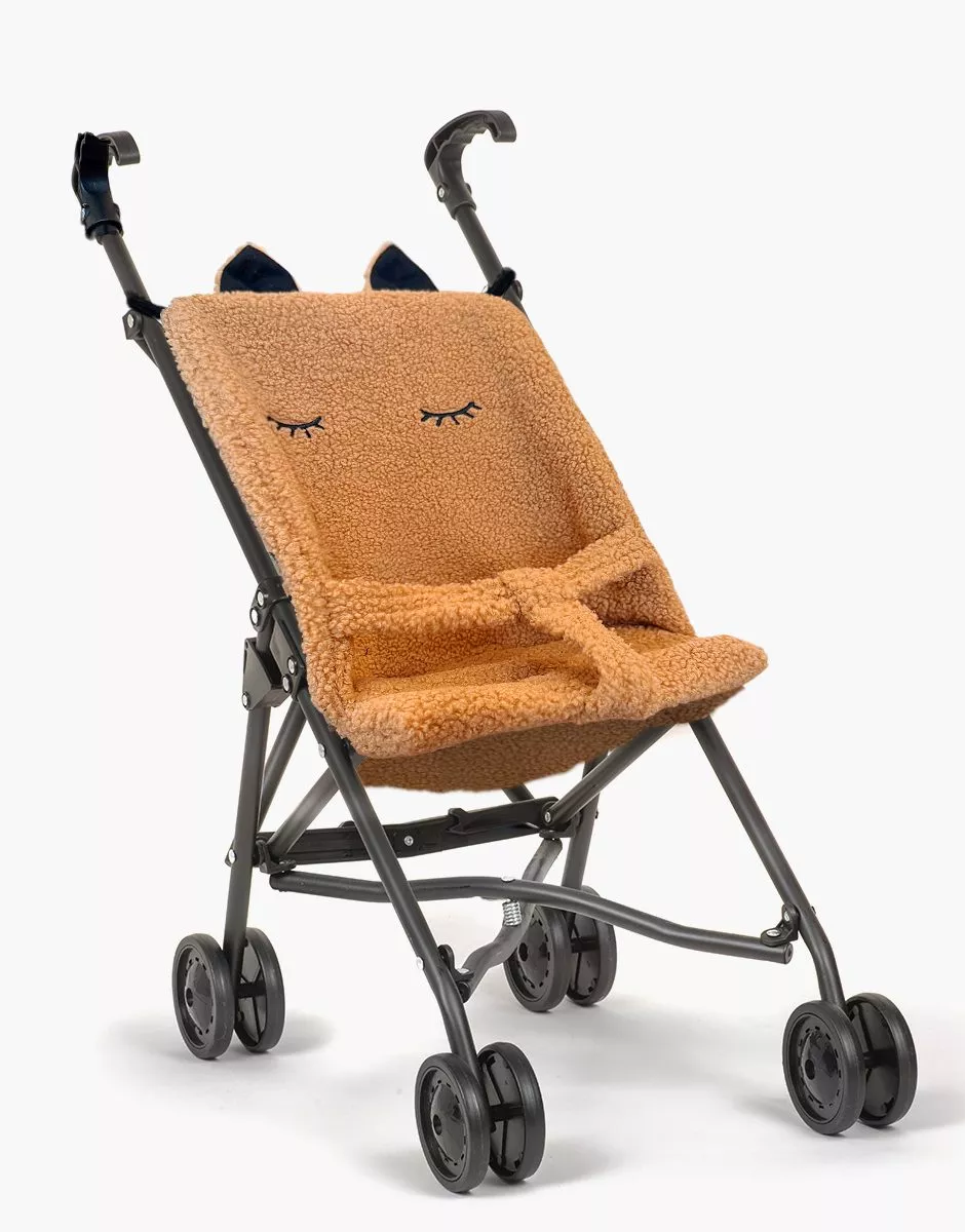 Poussette poupée Chat en bouclette camel sur châssis noir