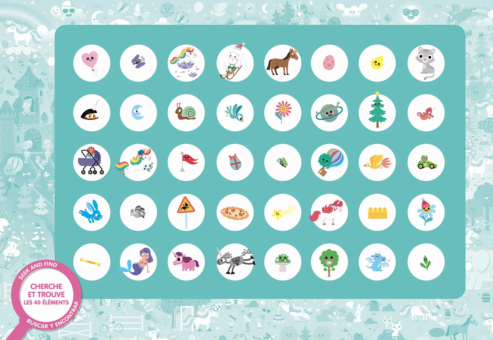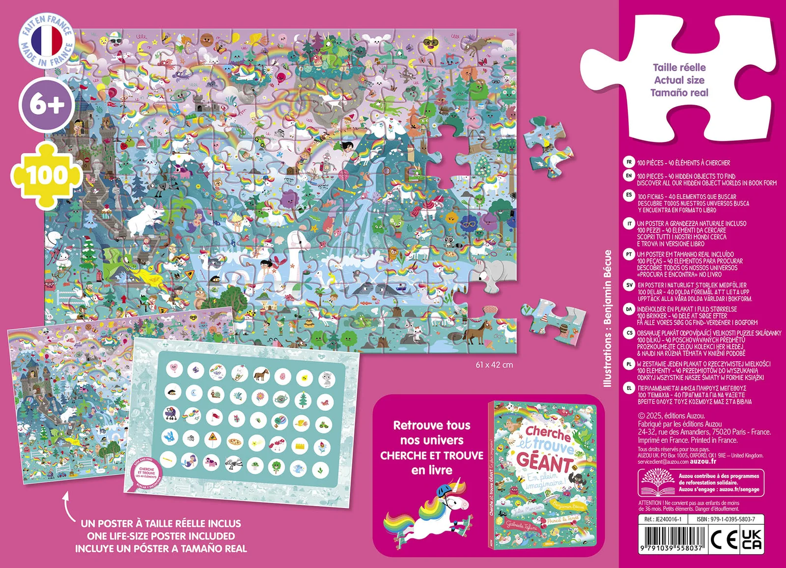 Puzzle cherche et trouve de 100 pièces sur le thème des licornes, fabriqué en France et adapté dès 6 ans. Avec son poster recto/verso, il prolonge le plaisir du jeu en invitant à chercher et retrouver de nombreux éléments dans une illustration féerique.