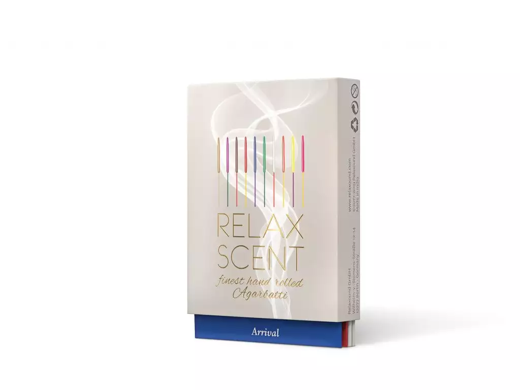 Relaxsents Encens, Relaxsound . Cinq parfums se nomment « Departure » et ont un effet stimulant, apportant force et énergie. Les 5 autres parfums, appelés « Arrival », sont conçus pour favoriser le repos et aider à faire une pause. Ils permettent de respirer profondément dans le tourbillon de la vie quotidienne. Coffret assorti de 10 encens.