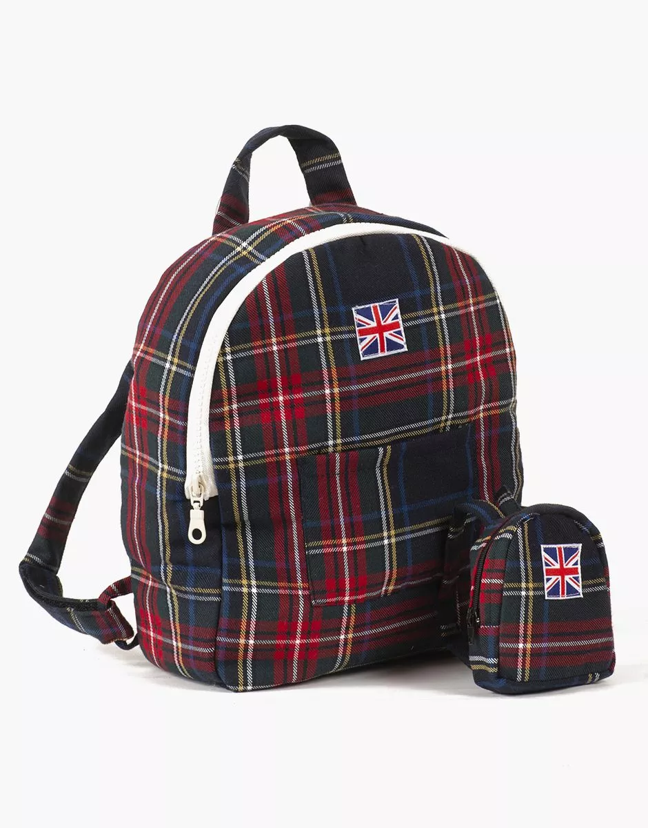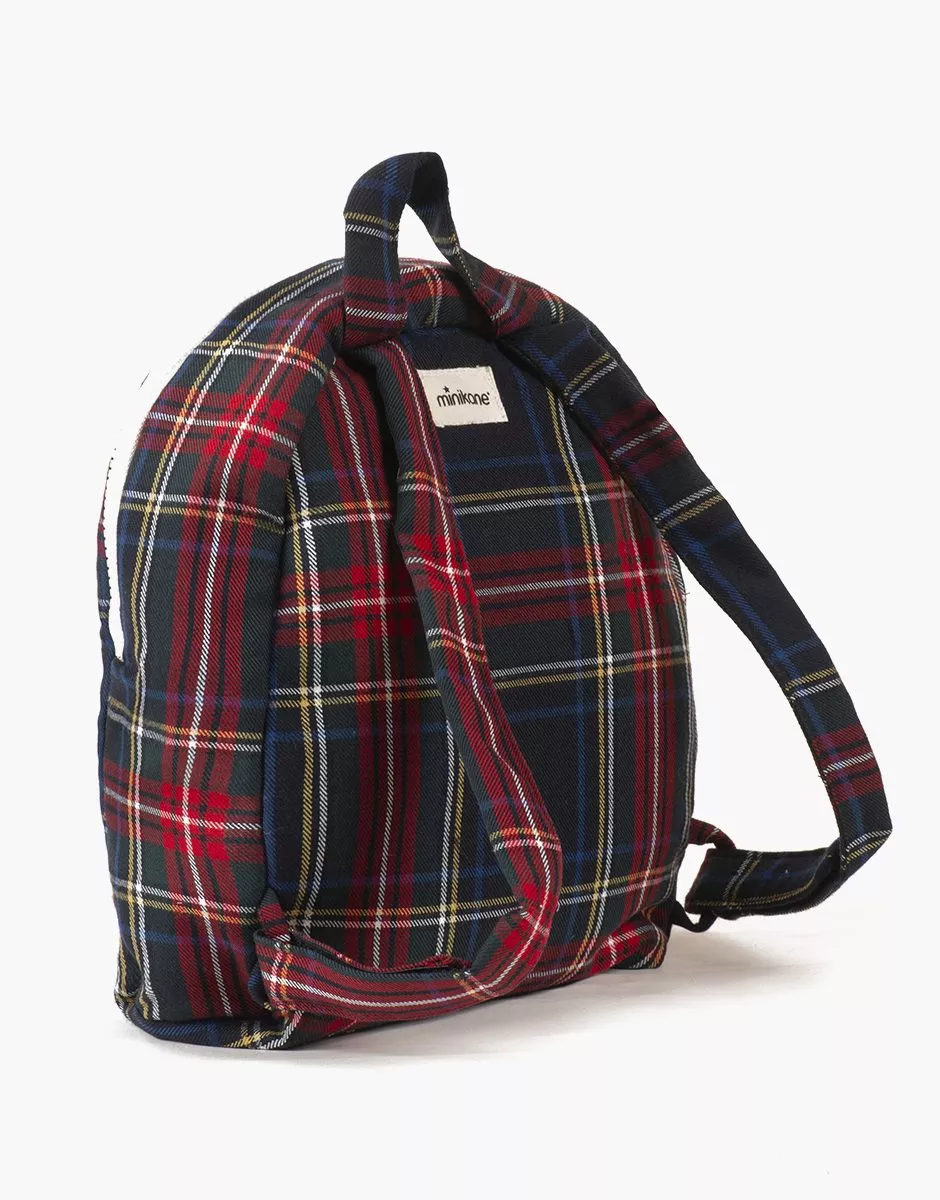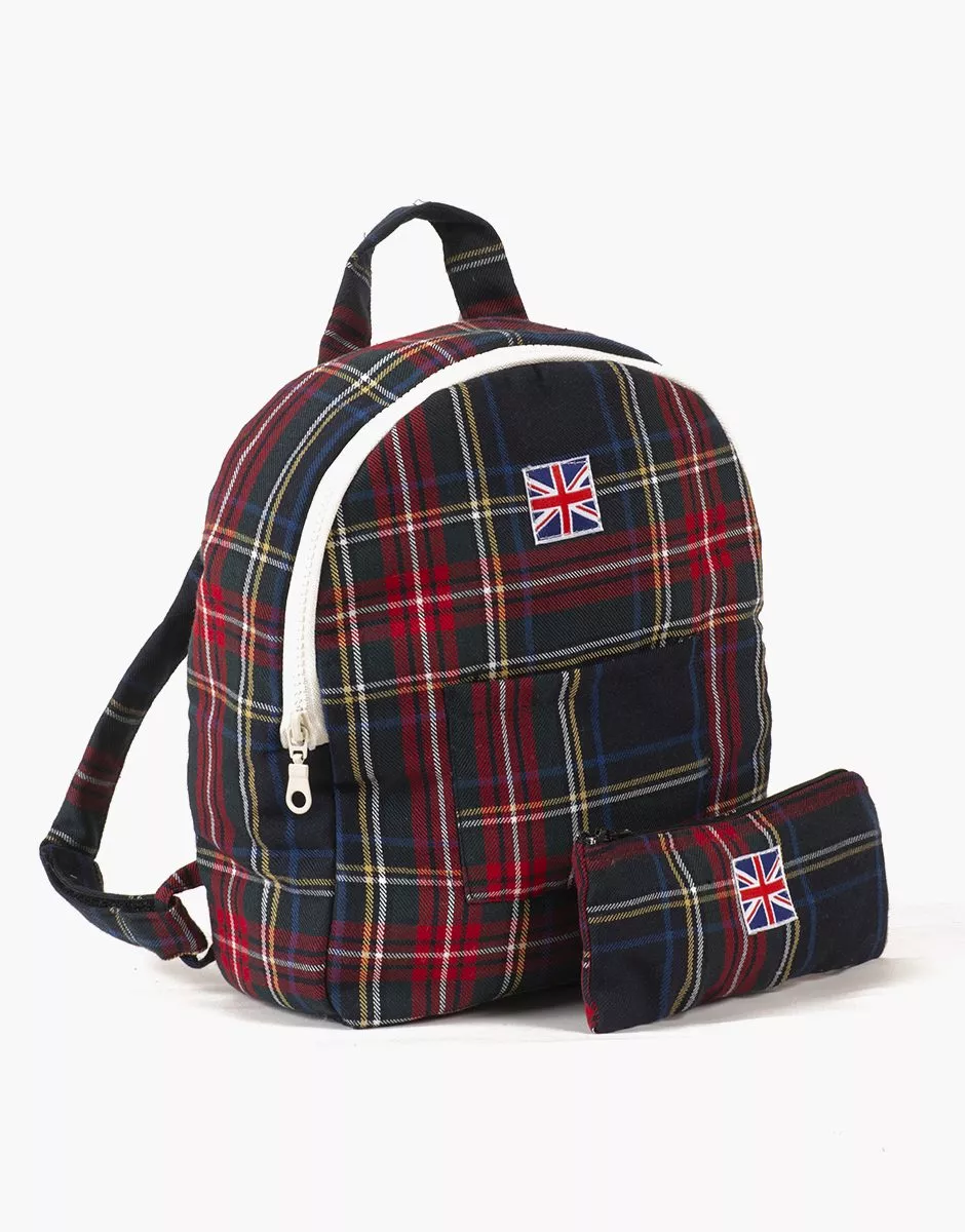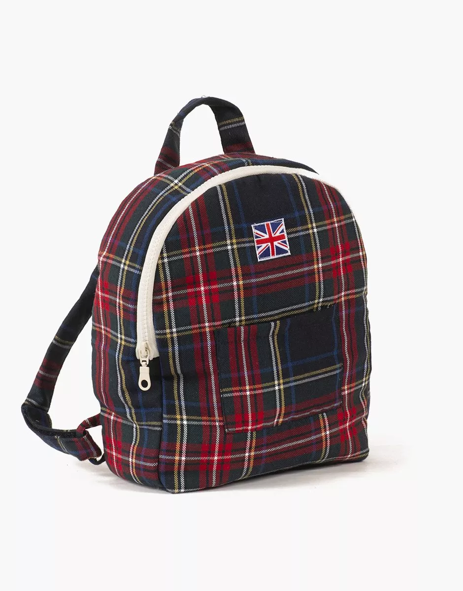 Collection capsule | Back to School in London Sac à dos Théo en tissu à carreaux Tartan avec fermeture éclaire et poche sur le devant pour enfants. Design, développement & confection MADE IN FRANCE. Design, development & tailoring made in France.
